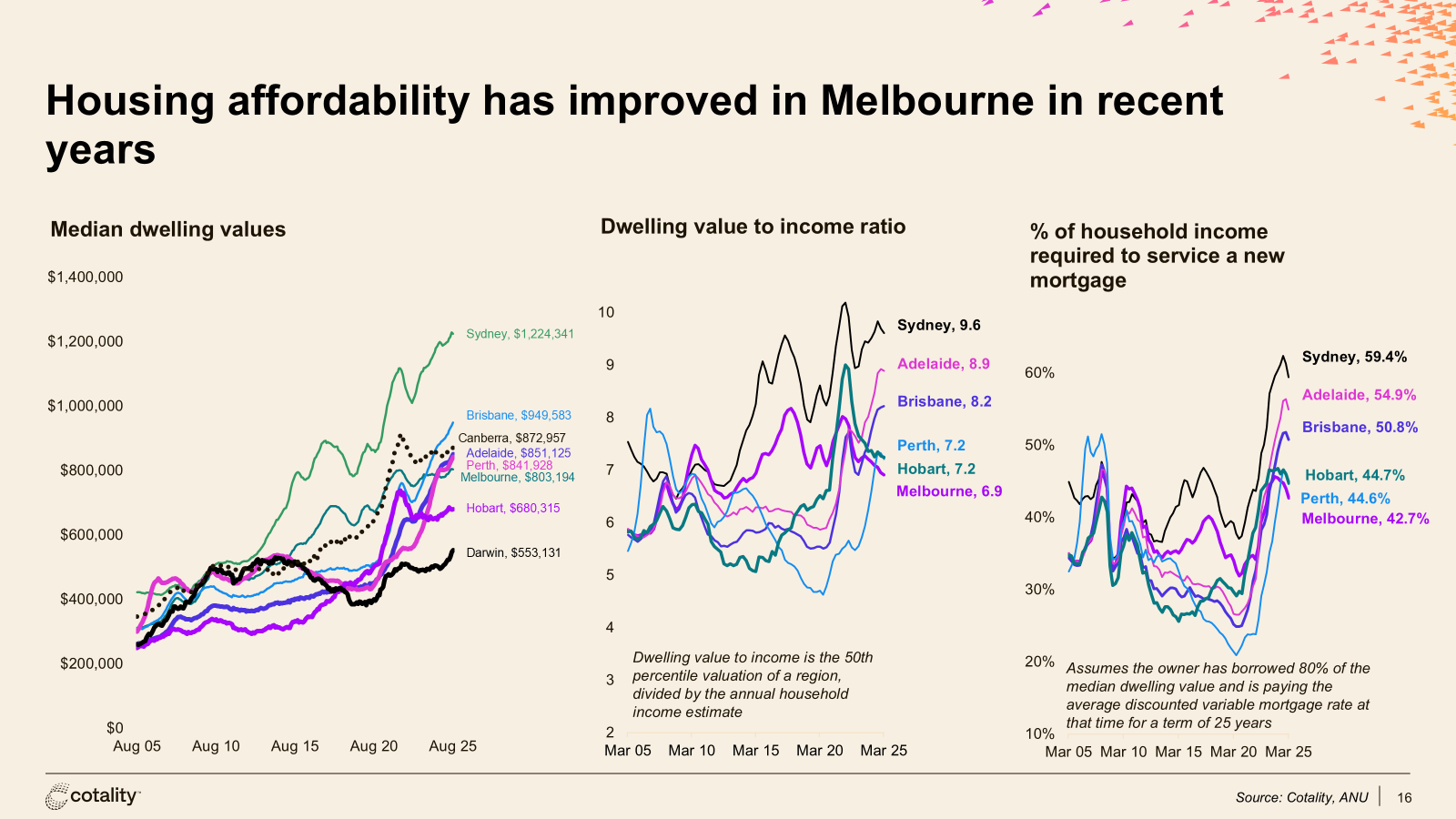 For metropolitan Melbourne, conditions have firmed slightly during winter. Cotality’s July read showed Melbourne up ~0.4% month-on-month, with annual growth nudging back into the black after a softer patch last year. That’s not a boom, and it won’t be. It’s a steady rebuild. Compared with Brisbane, Adelaide and Perth (already at record highs), Melbourne still offers relative value on most metrics, a point not lost on upgraders and returning migrants, with prices still 3.4% below the high of March 2022.