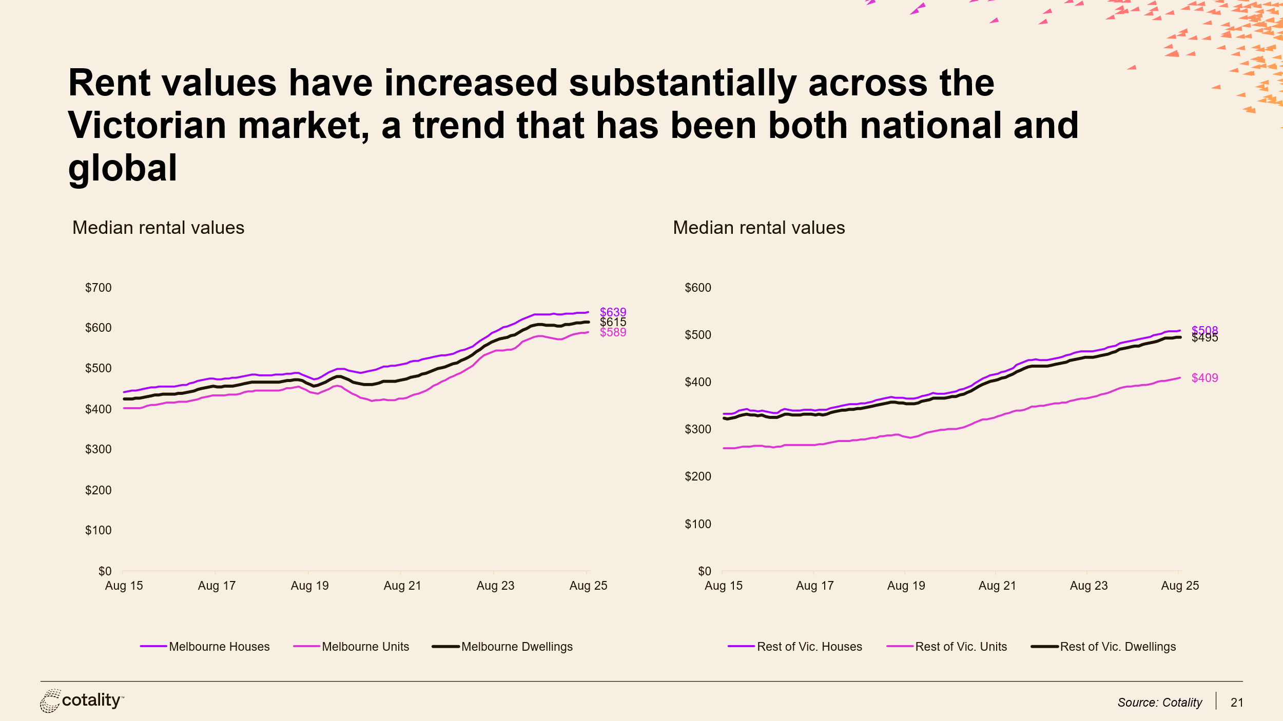 Rents surged sharply through 2023–24 in Melbourne PropTrack reports an annual average increase of nearly $8,600 a year (about 10.6%) as of mid‑2024. However the annual increase to July 2025 has cooled significantly. Whilst good news for renters, yields have moderated depressing investor demand until recently. The population outlook combined with an interest rate cutting cycle suggest upward pressure on rents and increased investor interest throughout both metropolitan and regional Victorian markets in the coming year.