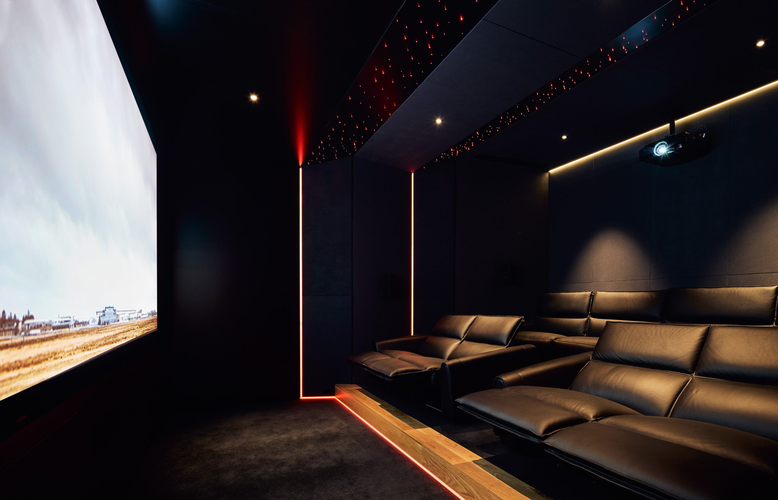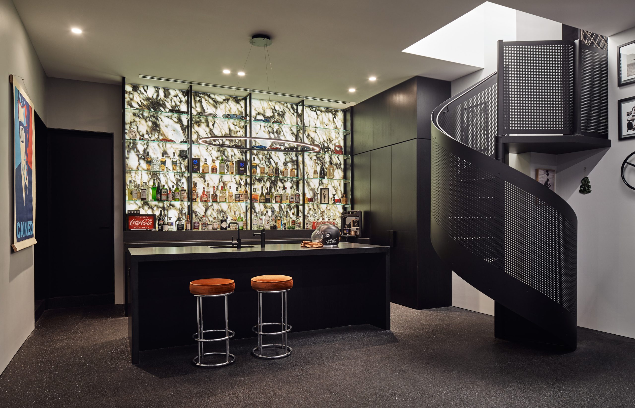 “We have a four-level lift, and we have a car lift which takes vehicles downstairs to both the garage and the workshop where you can have your cars washed and serviced. Also downstairs is the cinema and two cellars along with a bar featuring backlit onyx stone, accessed by a powder-coated aluminium Enxie staircase. ” – Vicki says.