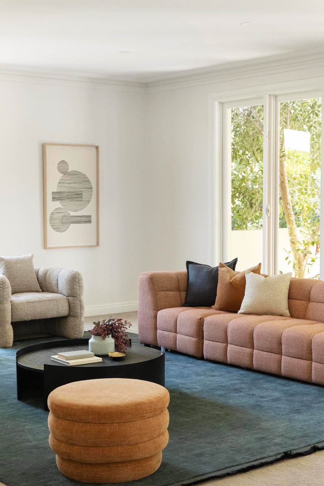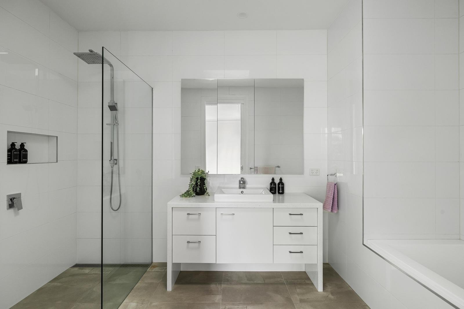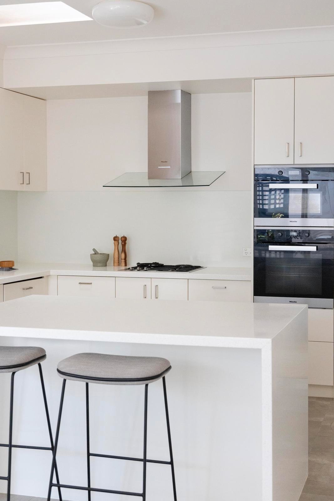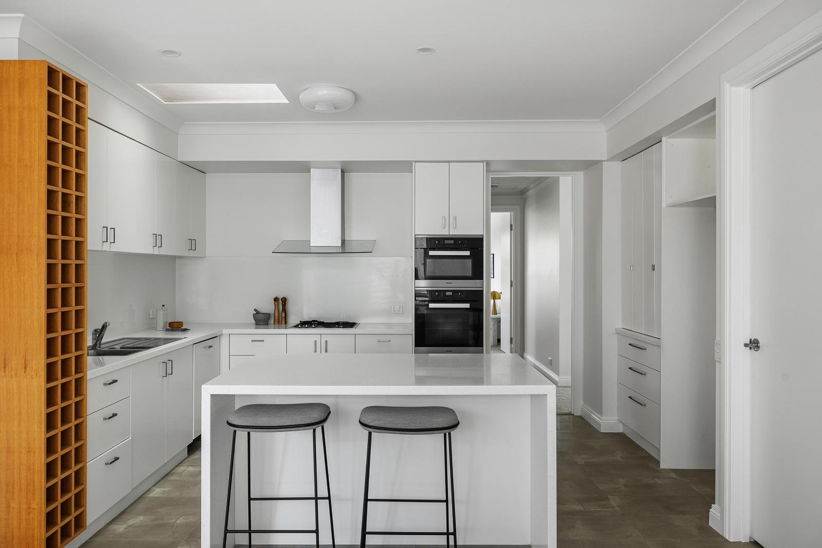 Within the home, sunlight drifts through glass and the garden, bringing warmth into the living spaces as they flow effortlessly from lounge to dining to secluded deck. The palette is soft and harmonious; pale timbers, smooth stone, and crisp white, all tied together with exceptional craftsmanship.