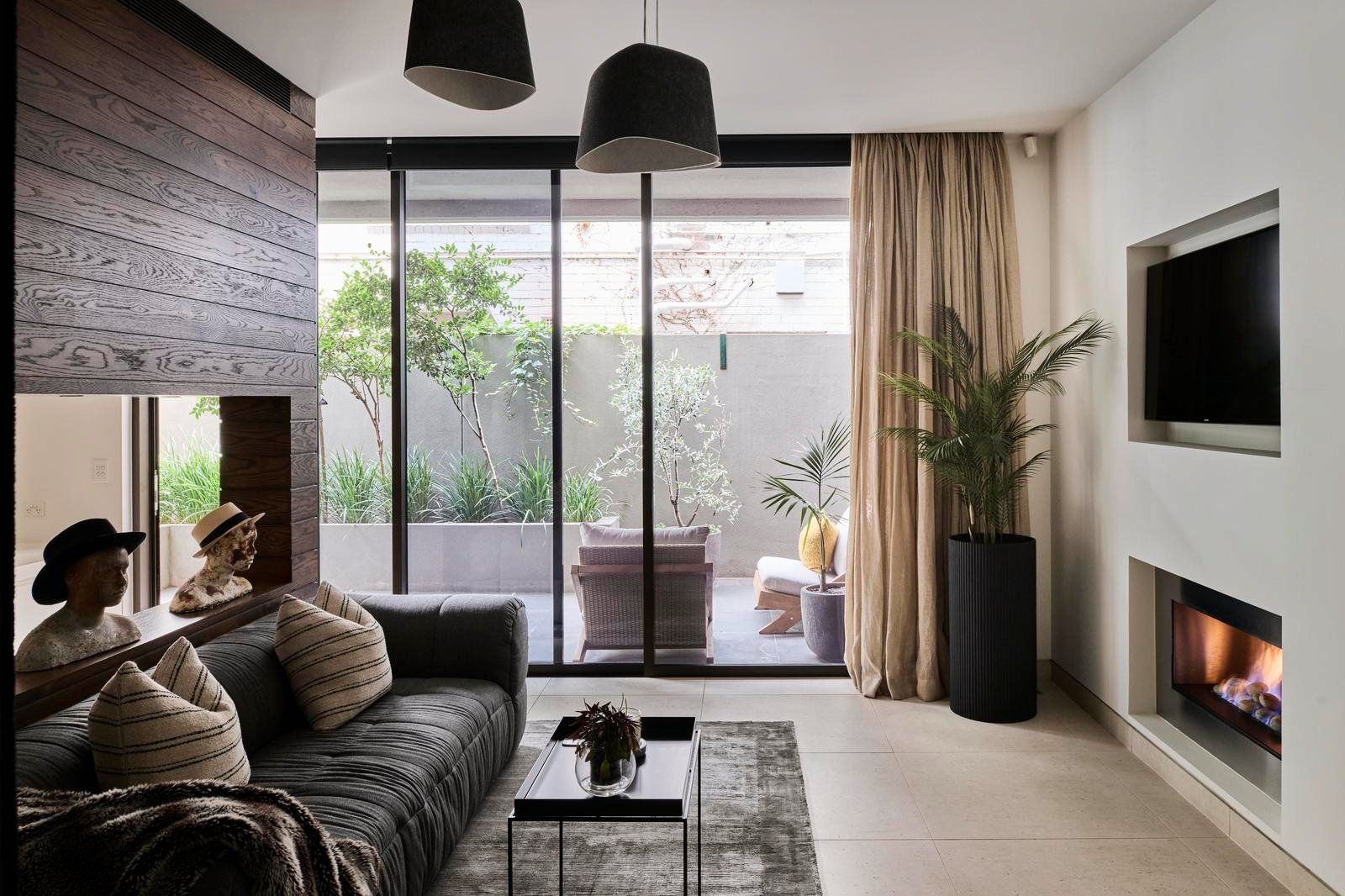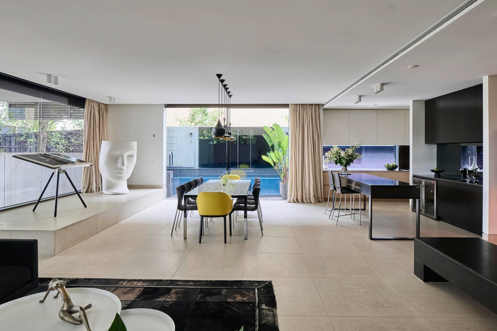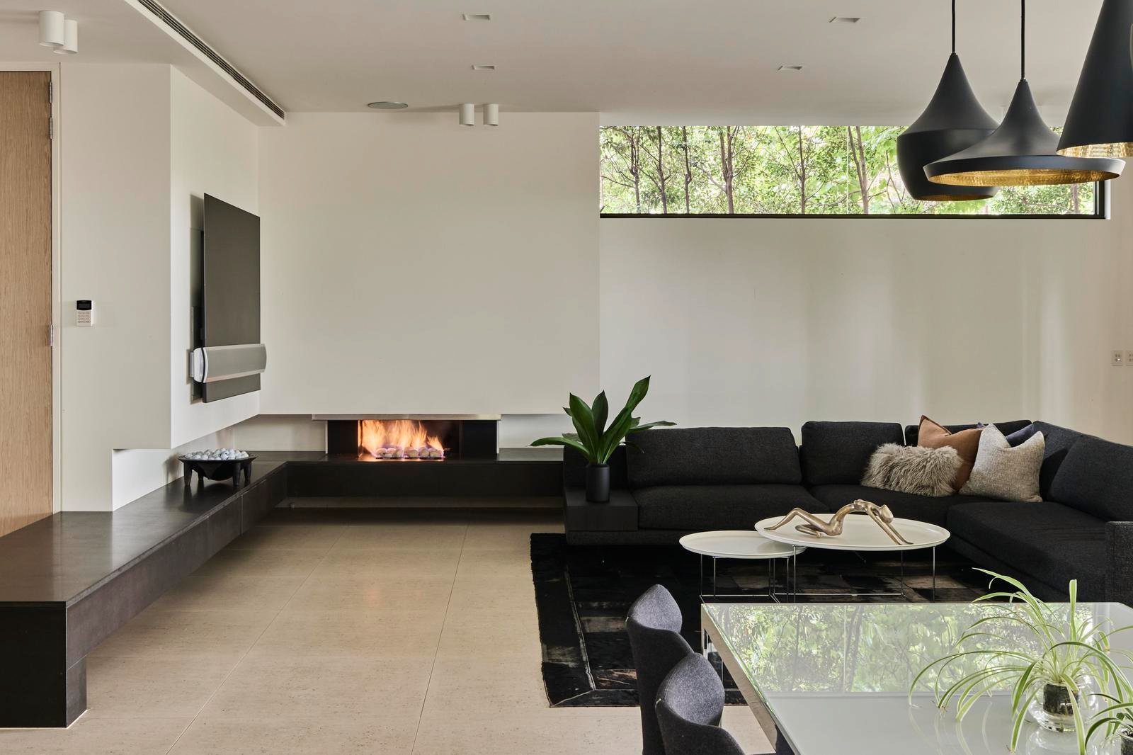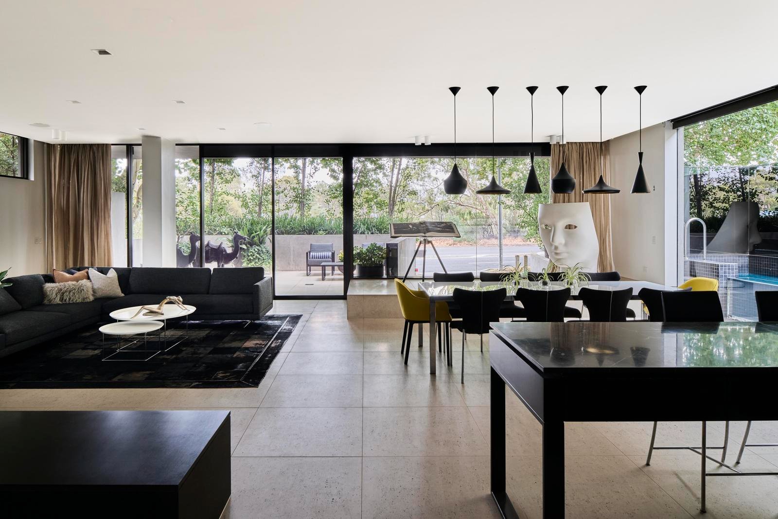 * Gallery like open plan living and dining with full-height glass and fireplace