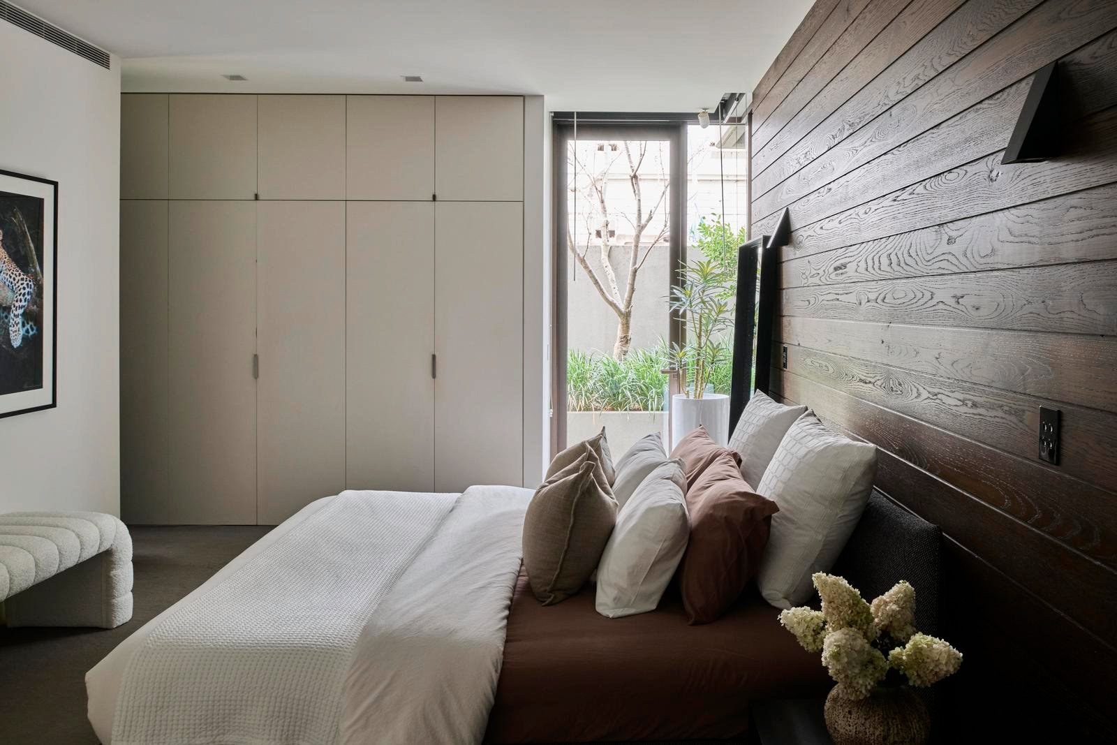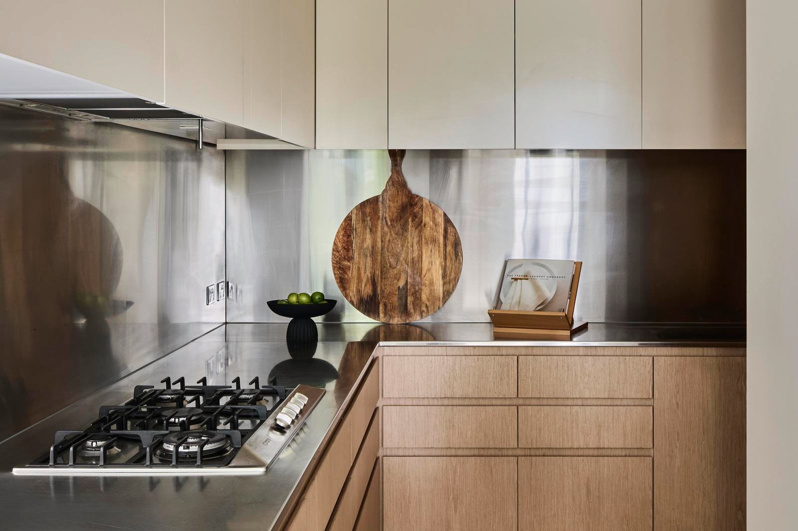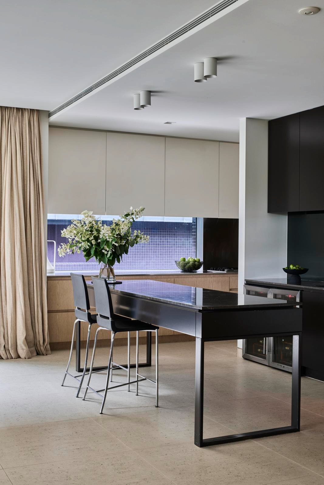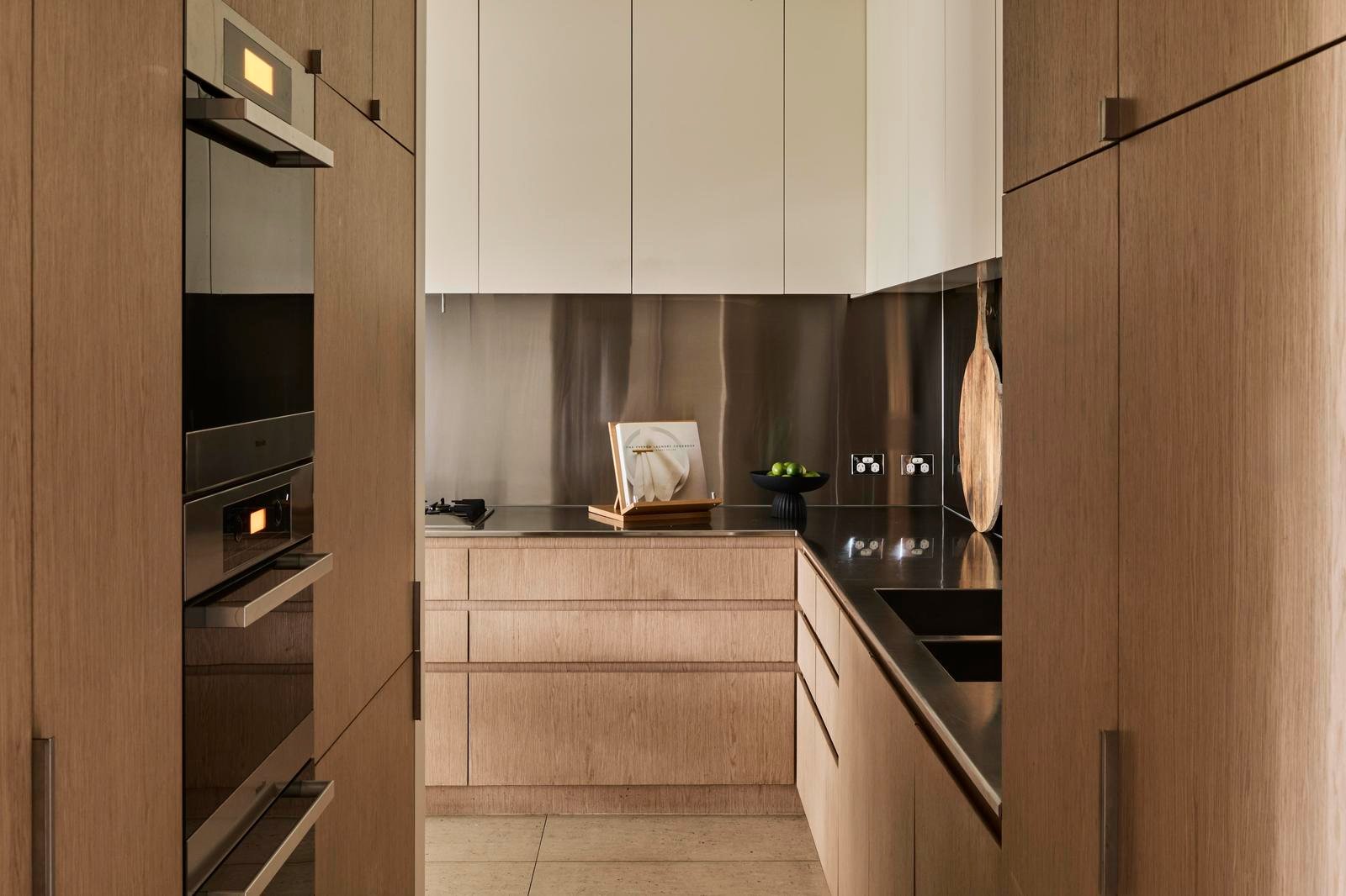 The kitchen is sleek and social with integrated appliances and beautifully detailed cabinetry that create a space designed for entertaining and everyday ease.
