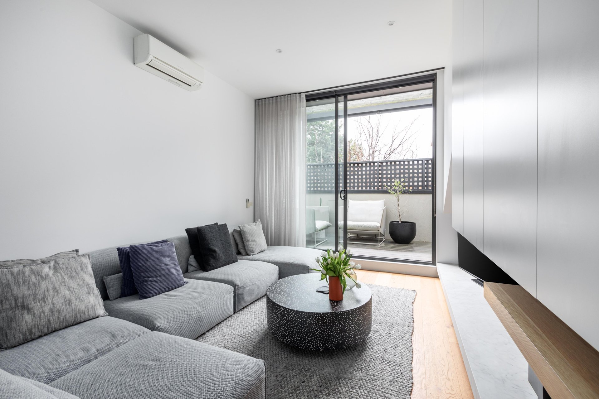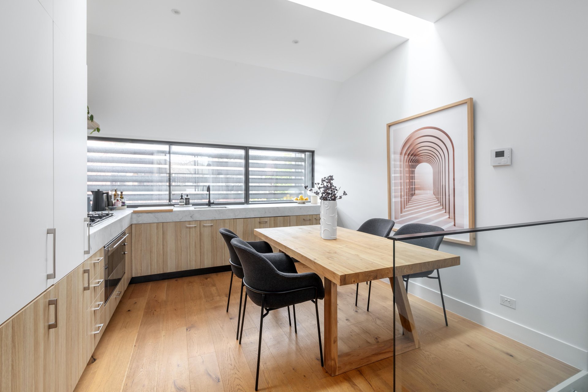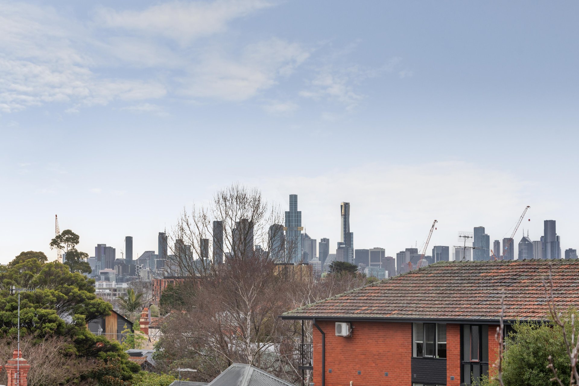 Warm timber, sculptural finishes, and thoughtful flow define this three-floor apartment—crowned with a private rooftop terrace and sweeping city skyline views. The kitchen—with its stone-wrapped bench, timber cabinetry, and seamless access to the deck—is both a beautiful design piece and highly functional. The open-plan living area is calm, minimal, and inviting, with integrated shelving and an inbuilt desk nook. Two serene bedrooms feature soft neutrals, sheer curtains, and built-in robes. The bathroom is sleek and restrained, with charcoal tiling, stone benchtop, and floating vanity. Sliding doors open to a sunny balcony, while the rooftop—timber-decked and city-facing—offers expansive room to lounge in the sun, host rooftop dinners, and enjoy panoramic views. This home is a thoughtfully designed retreat of texture, tone, and light. Enjoy a quiet street right near the action. Pick up coffee on High Street, walk to local parks, and explore Chapel Street’s dining, retail and nightlife. Trams and trains are within easy reach, as are arterial roads, giving you urban convenience—combined with peace and quiet.