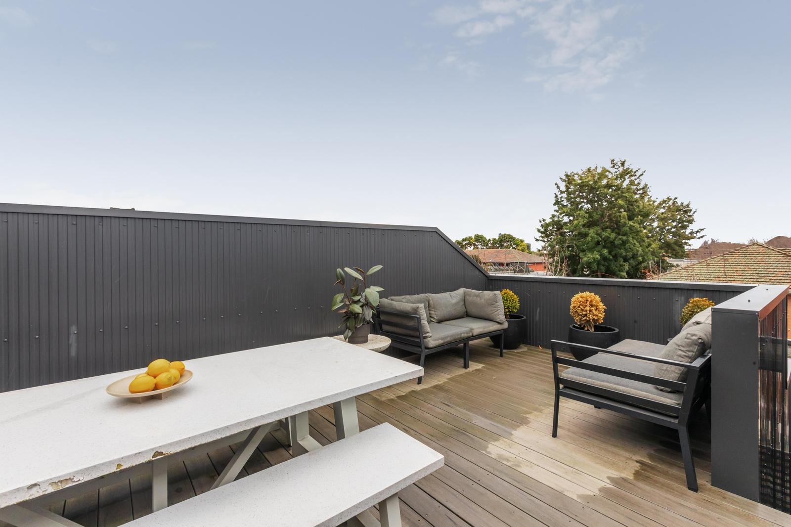 Sliding doors open to a sunny balcony, while the rooftop—timber-decked and city-facing—offers expansive room to lounge in the sun, host rooftop dinners, and enjoy panoramic views. This home is a thoughtfully designed retreat of texture, tone, and light.