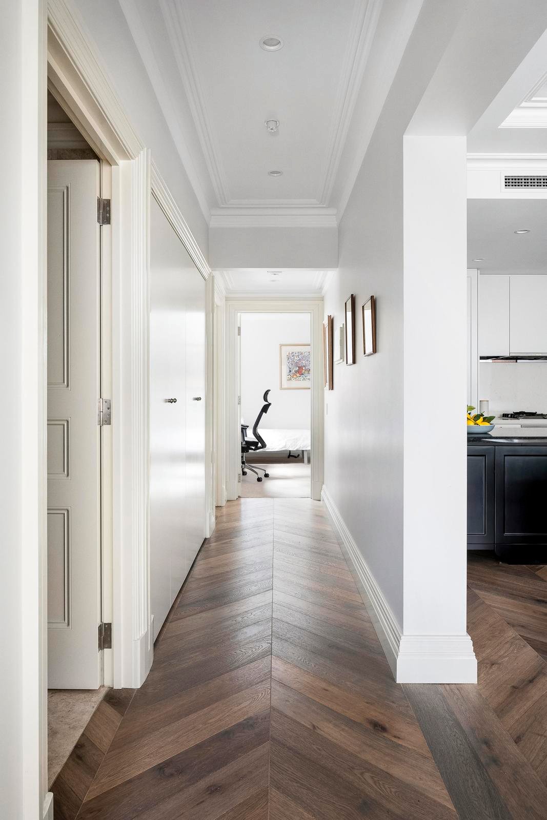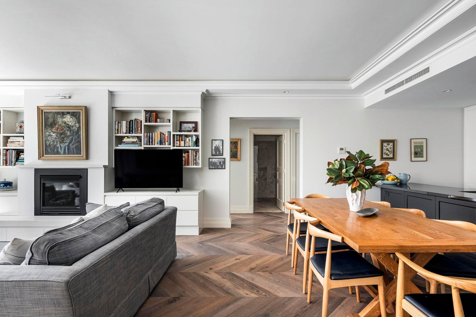 Inside, chevron oak floors sweep through generous open-plan living where a gas fireplace, bespoke joinery, and full-height glass frame a refined setting. The kitchen is beautifully appointed with European appliances, a glossy black bench, and abundant storage.
