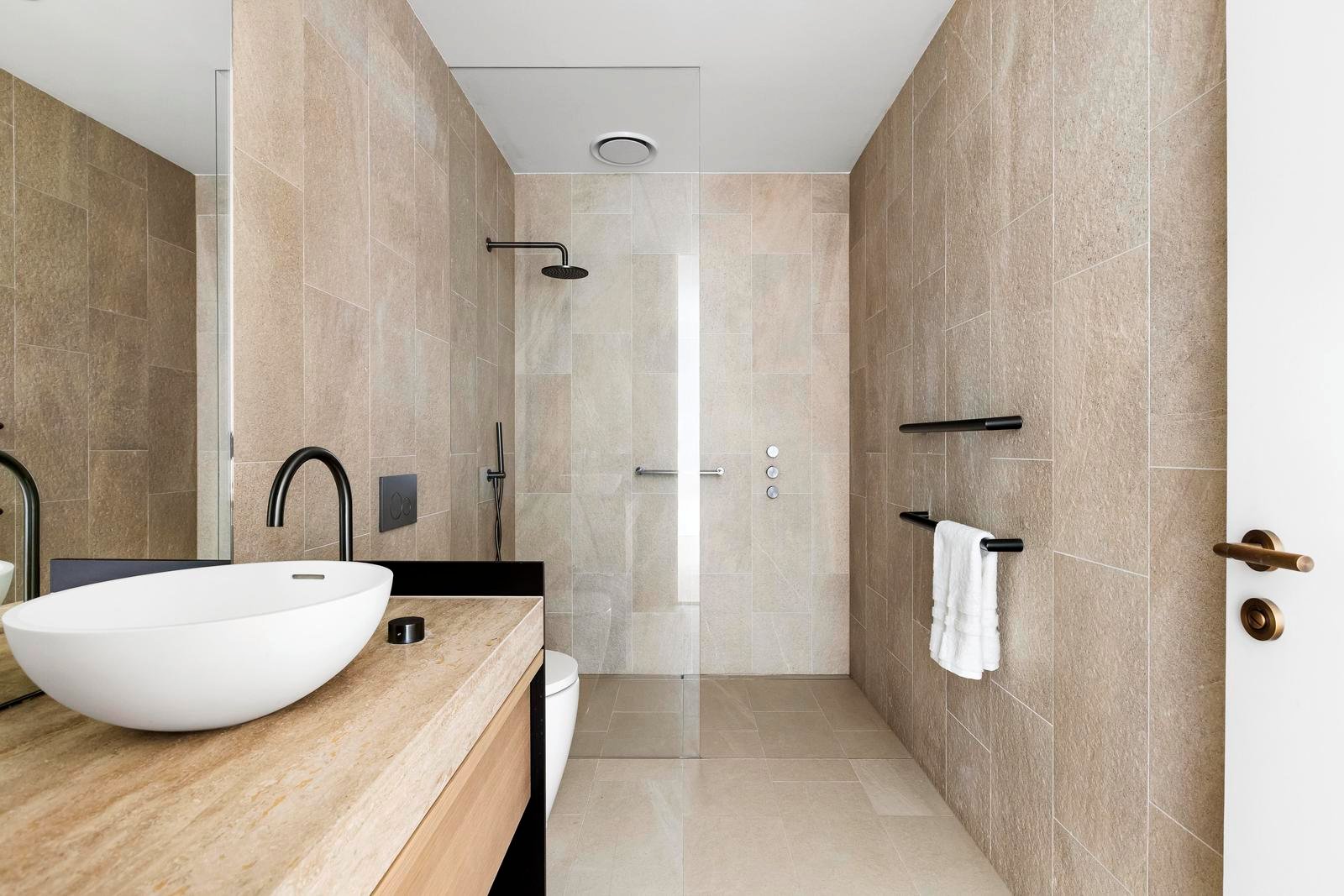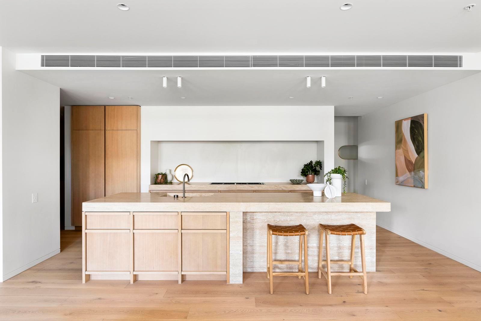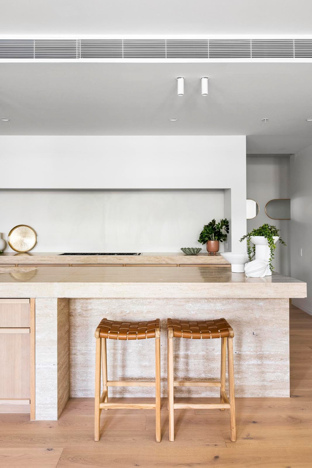 The palette is rich and sophisticated—travertine and limestone layered with pale timber and subtle texture. The kitchen’s sculptural island is a piece of art, anchoring the living space with complementary Miele and Barazza appliances and a concealed butler’s pantry. Bathrooms are immersive and elegant, wrapped in stone with twin basins and a freestanding bath.