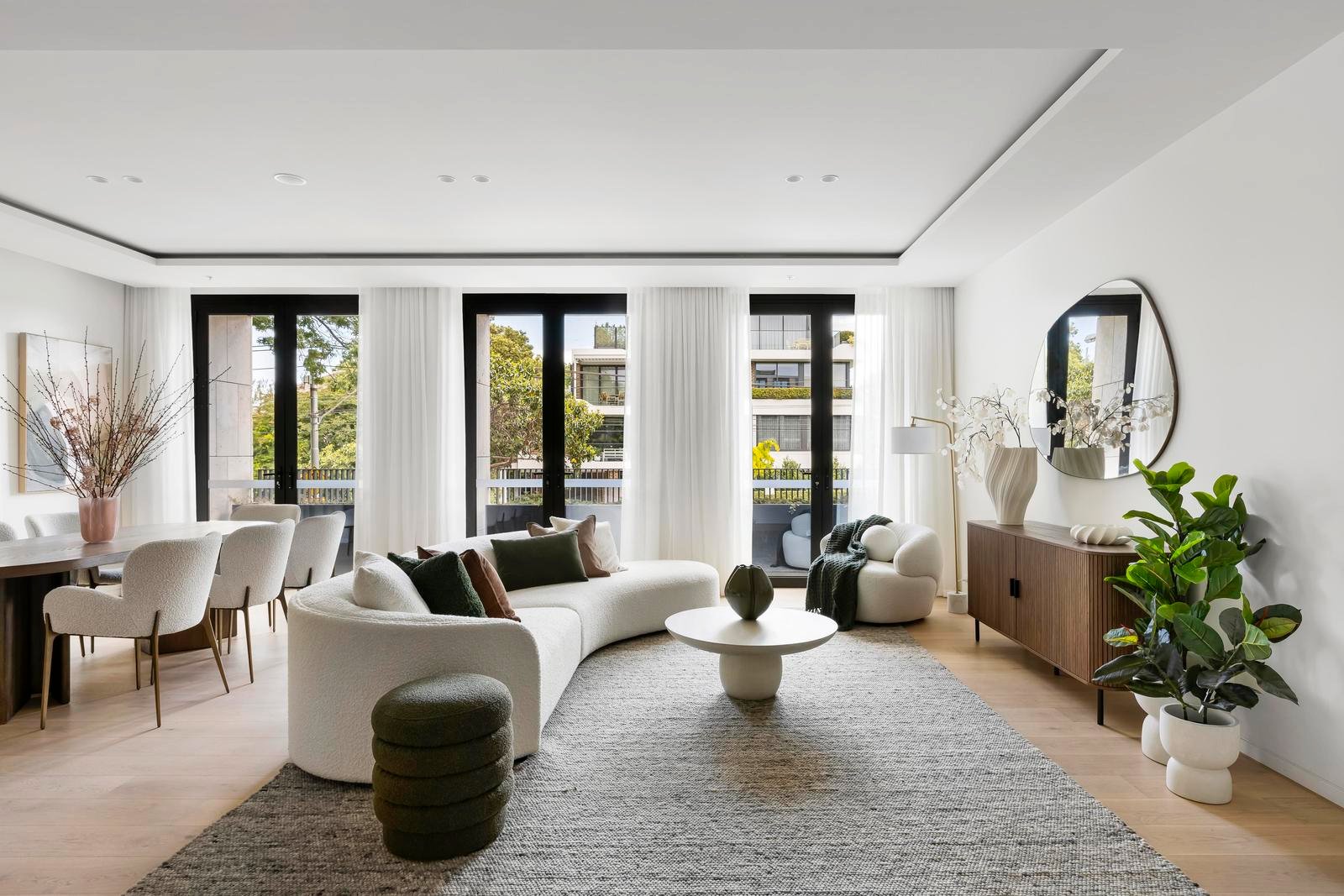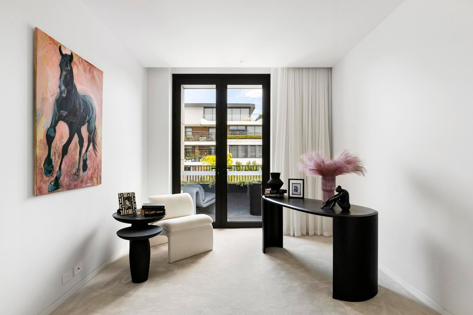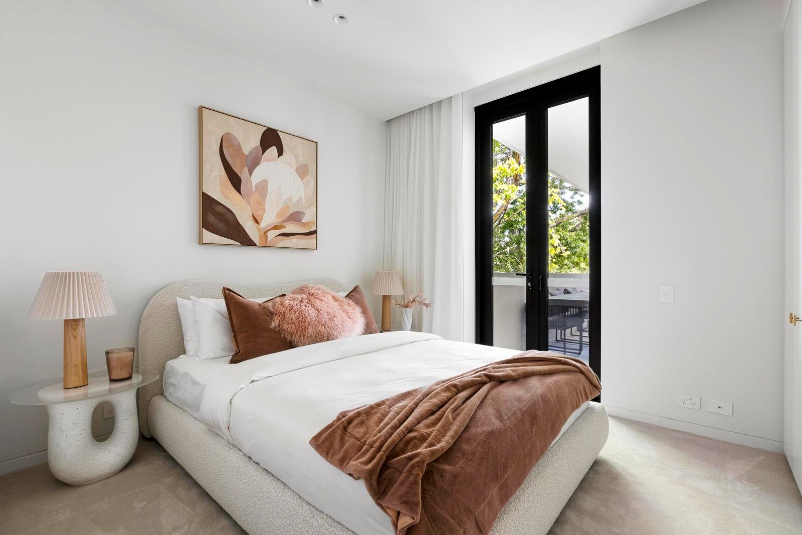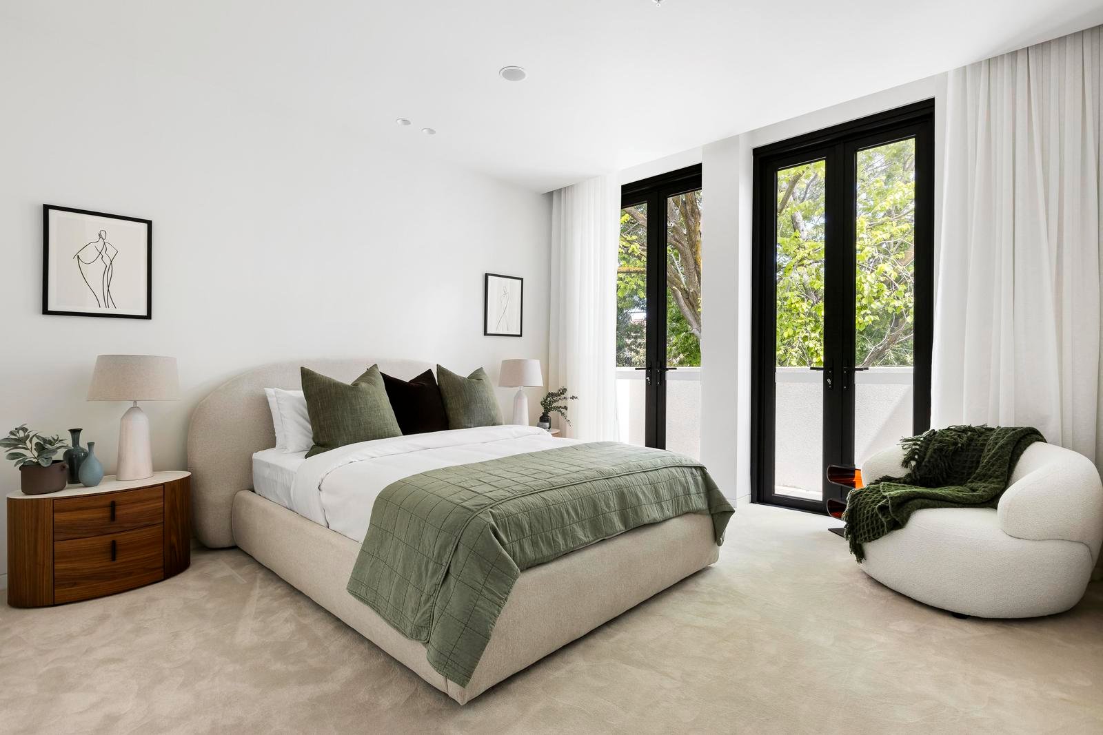 Three serene bedrooms include a main suite with a walk-in robe and an ensuite of grand proportions. The second bedroom offers balcony access, while the third provides versatility as a guest room, study or retreat.