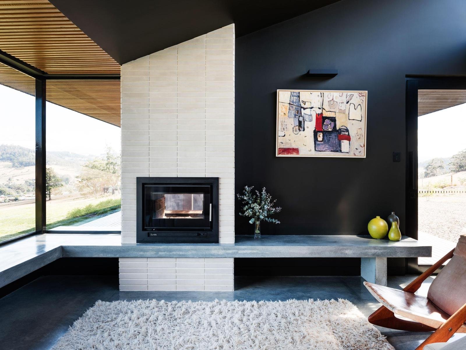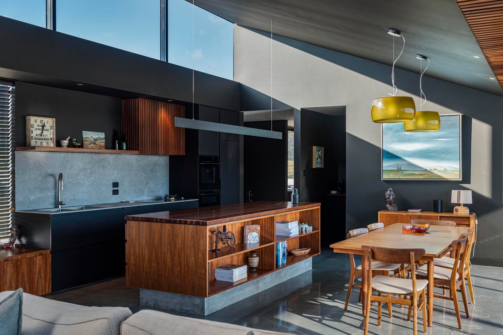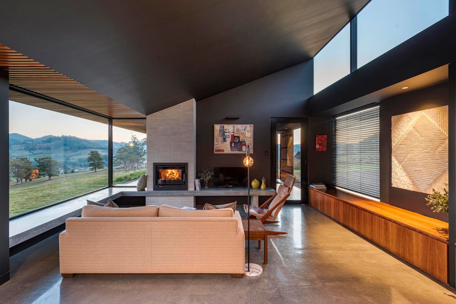 The main living pavilion unfolds beneath soaring ceilings, where walls of glass frame sweeping vistas across the bay and surrounding countryside. Polished concrete floors, a wood heater and warm timber detailing establish a grounded yet sophisticated interior, complemented by mid-century influences evident in the internal and external brick fireplaces. The kitchen sits confidently at the heart of the home, pairing dark cabinetry with rich timber accents to anchor the open-plan living and dining space.
