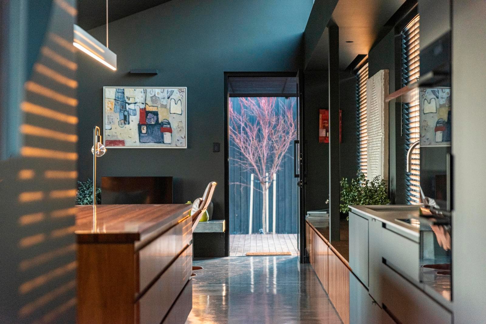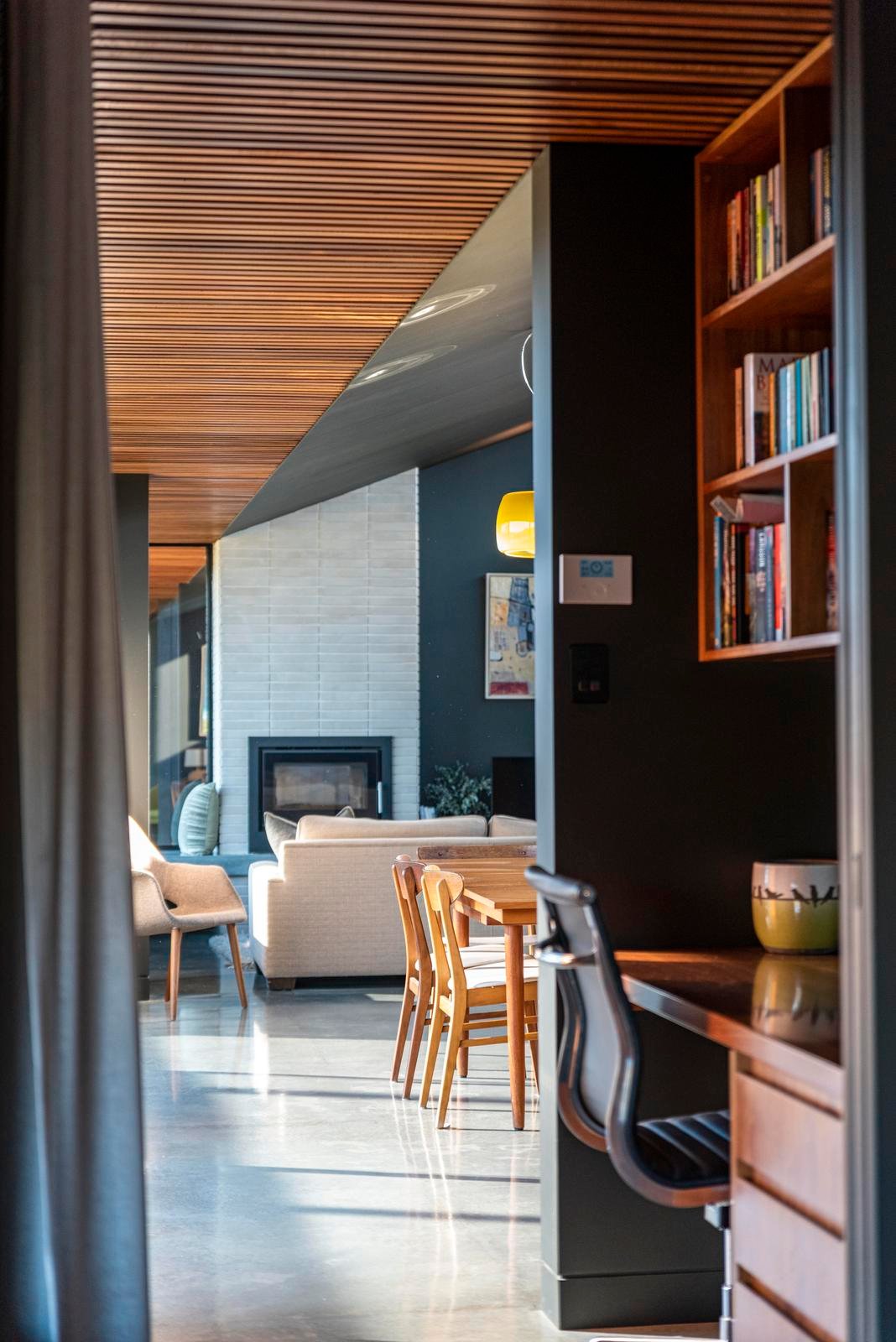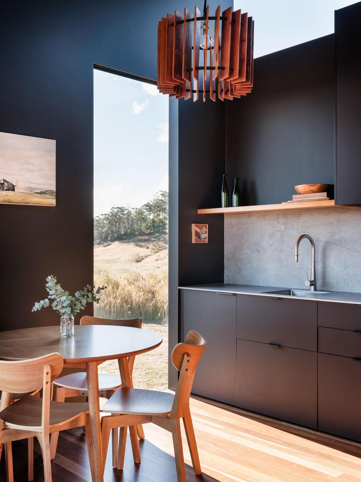 The main living pavilion unfolds beneath soaring ceilings, where walls of glass frame sweeping vistas across the bay and surrounding countryside. Polished concrete floors, a wood heater and warm timber detailing establish a grounded yet sophisticated interior, complemented by mid-century influences evident in the internal and external brick fireplaces. The kitchen sits confidently at the heart of the home, pairing dark cabinetry with rich timber accents to anchor the open-plan living and dining space.