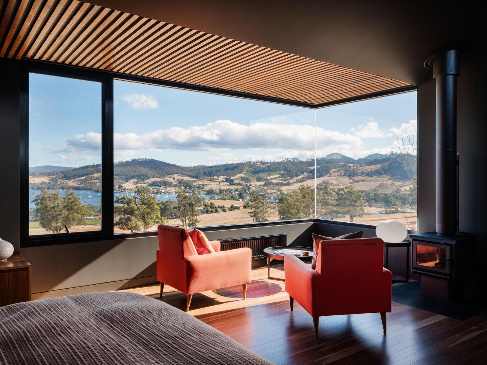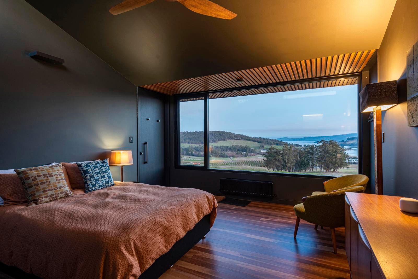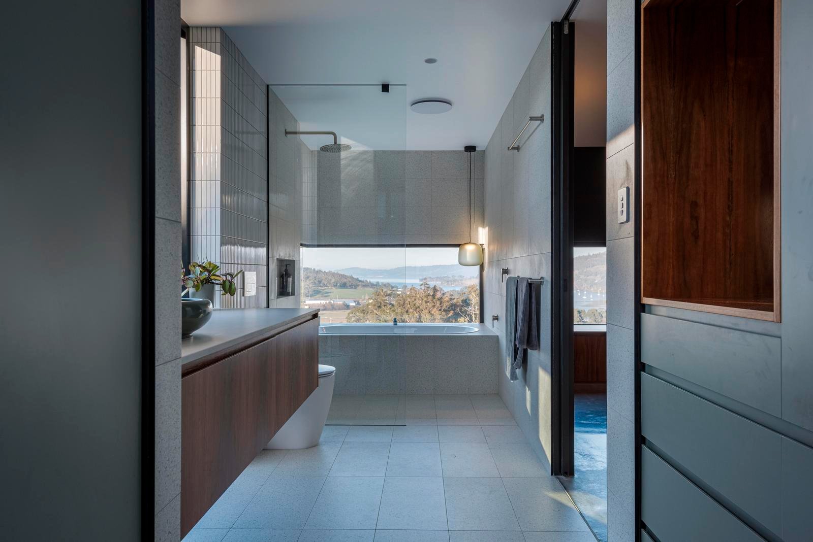 The master suite is thoughtfully positioned to capture the morning light and commanding views over Port Cygnet. Its ensuite is a serene retreat, featuring a deep soaking bath framed by sky and landscape.