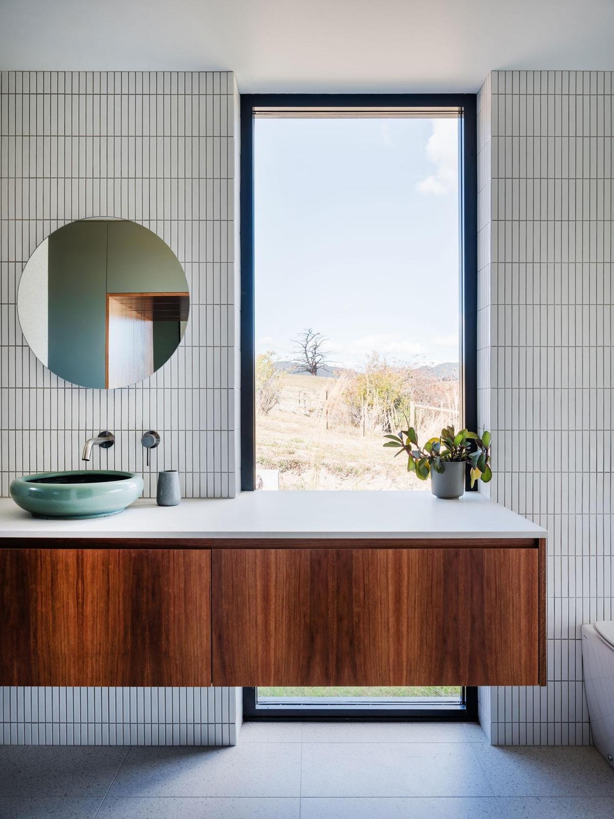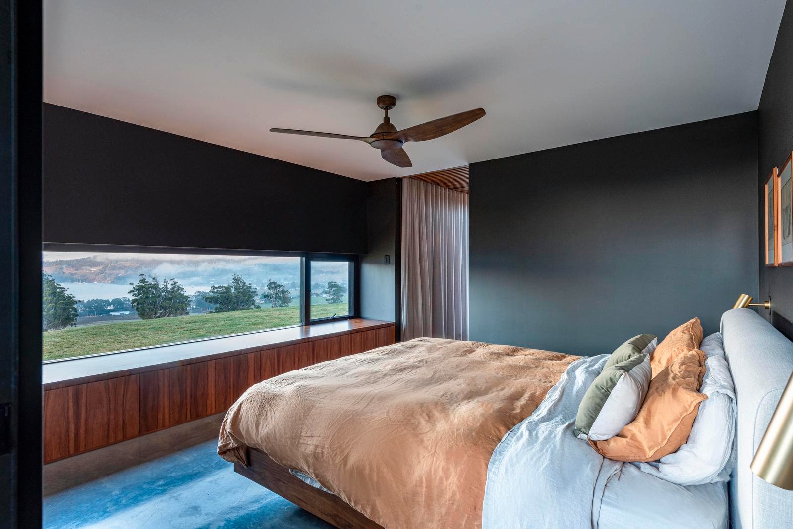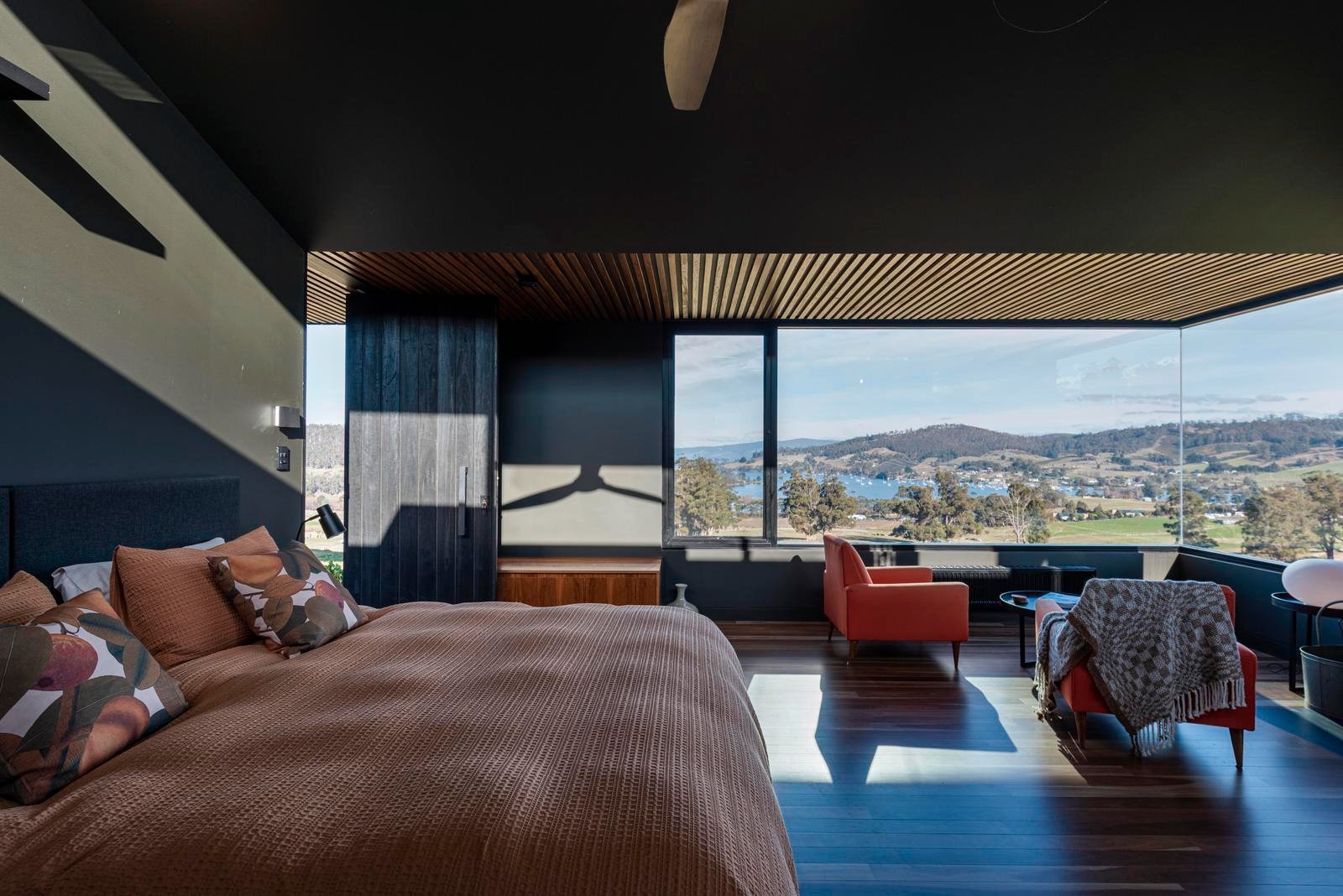 The master suite is thoughtfully positioned to capture the morning light and commanding views over Port Cygnet. Its ensuite is a serene retreat, featuring a deep soaking bath framed by sky and landscape.