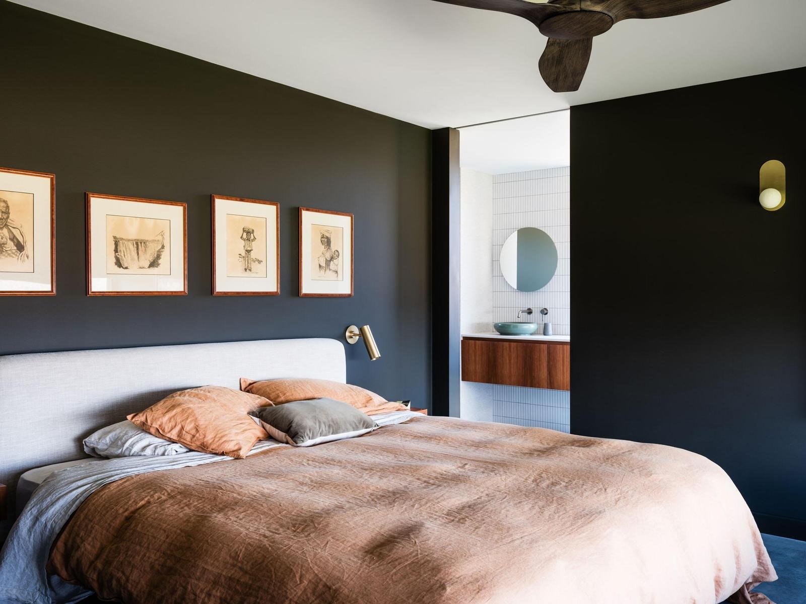 A covered walkway leads to the second pavilion, offering a private guest suite with its own ensuite and elevated outlook. Sliding screens wrap the courtyard spaces, allowing each outdoor area to be tailored for light, shelter, privacy or breeze.