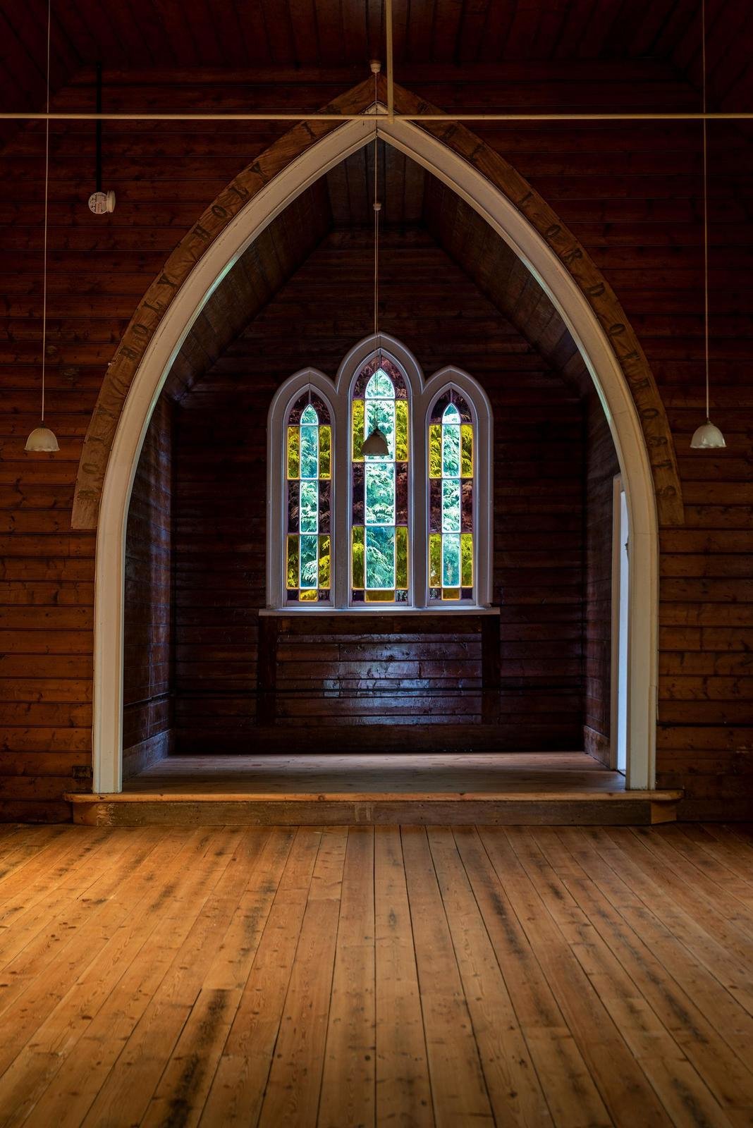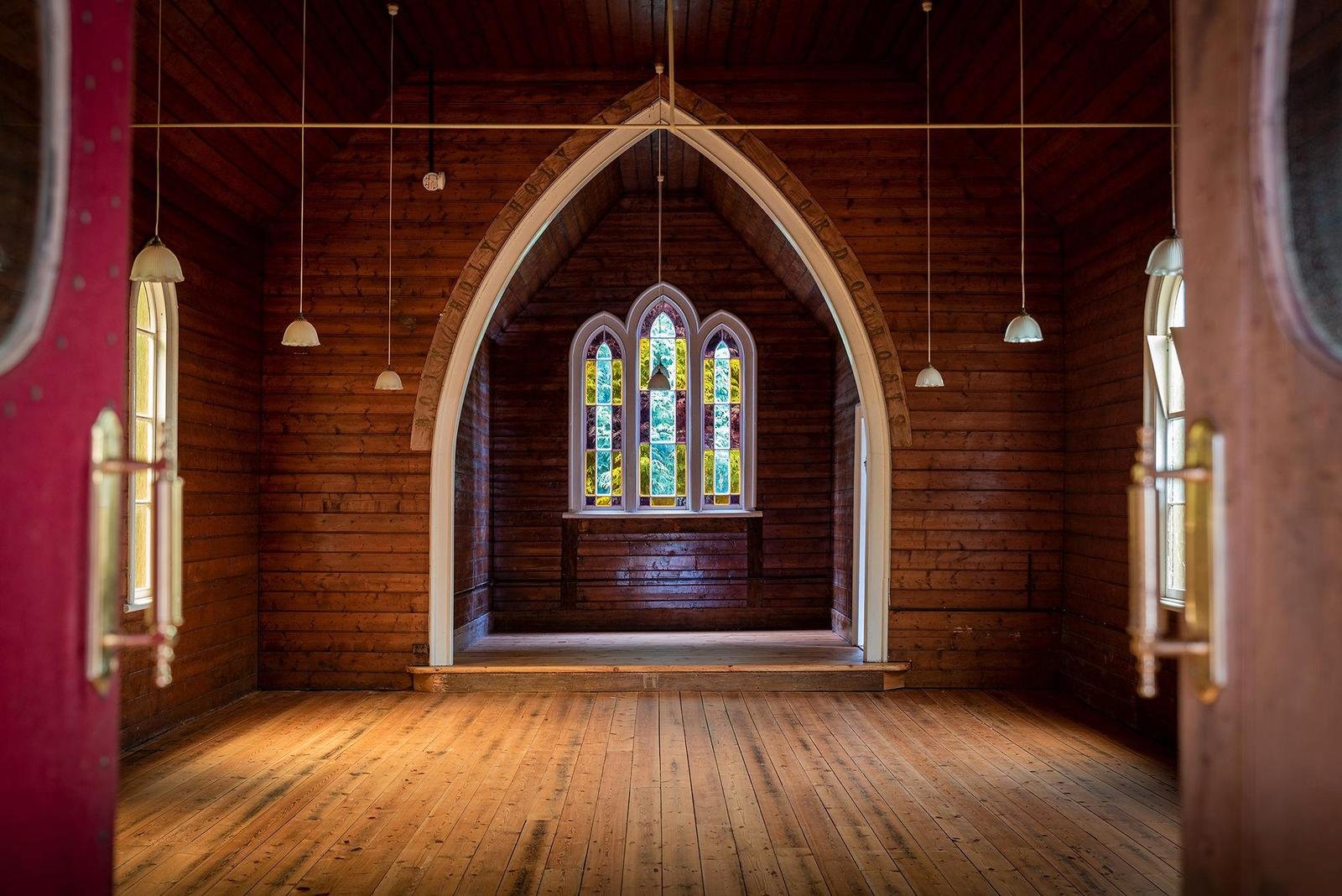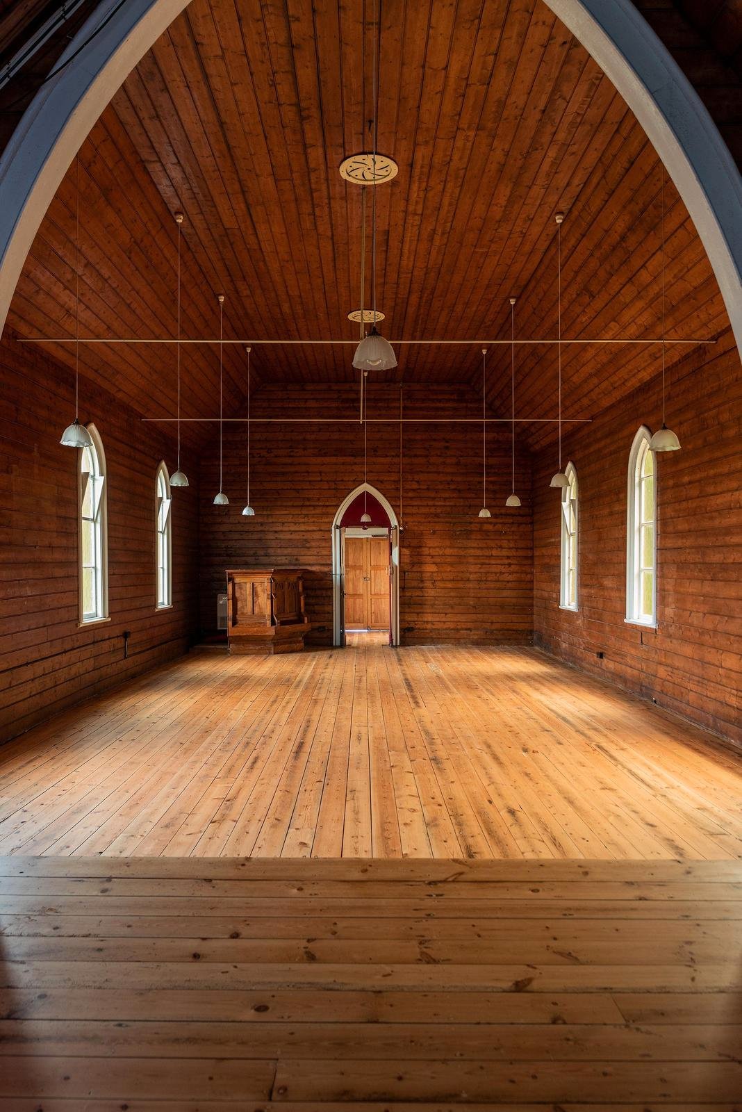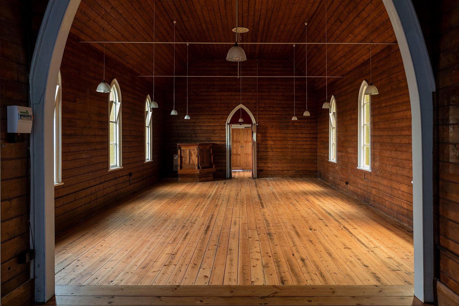 Deconsecrated in 2013 and heritage listed, the building retains the quiet beauty and atmosphere of its past. Inside, coloured light filters through stained glass windows and falls across warm Baltic pine walls and soaring timber ceilings. The original proportions of the church remain intact, creating an expansive open interior that feels both peaceful and inspiring.