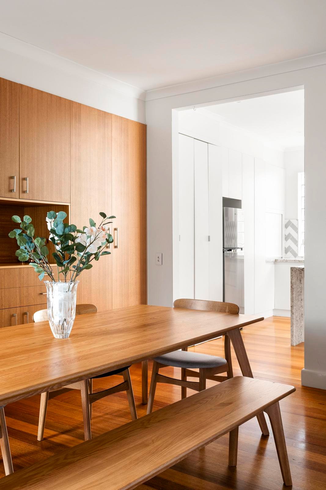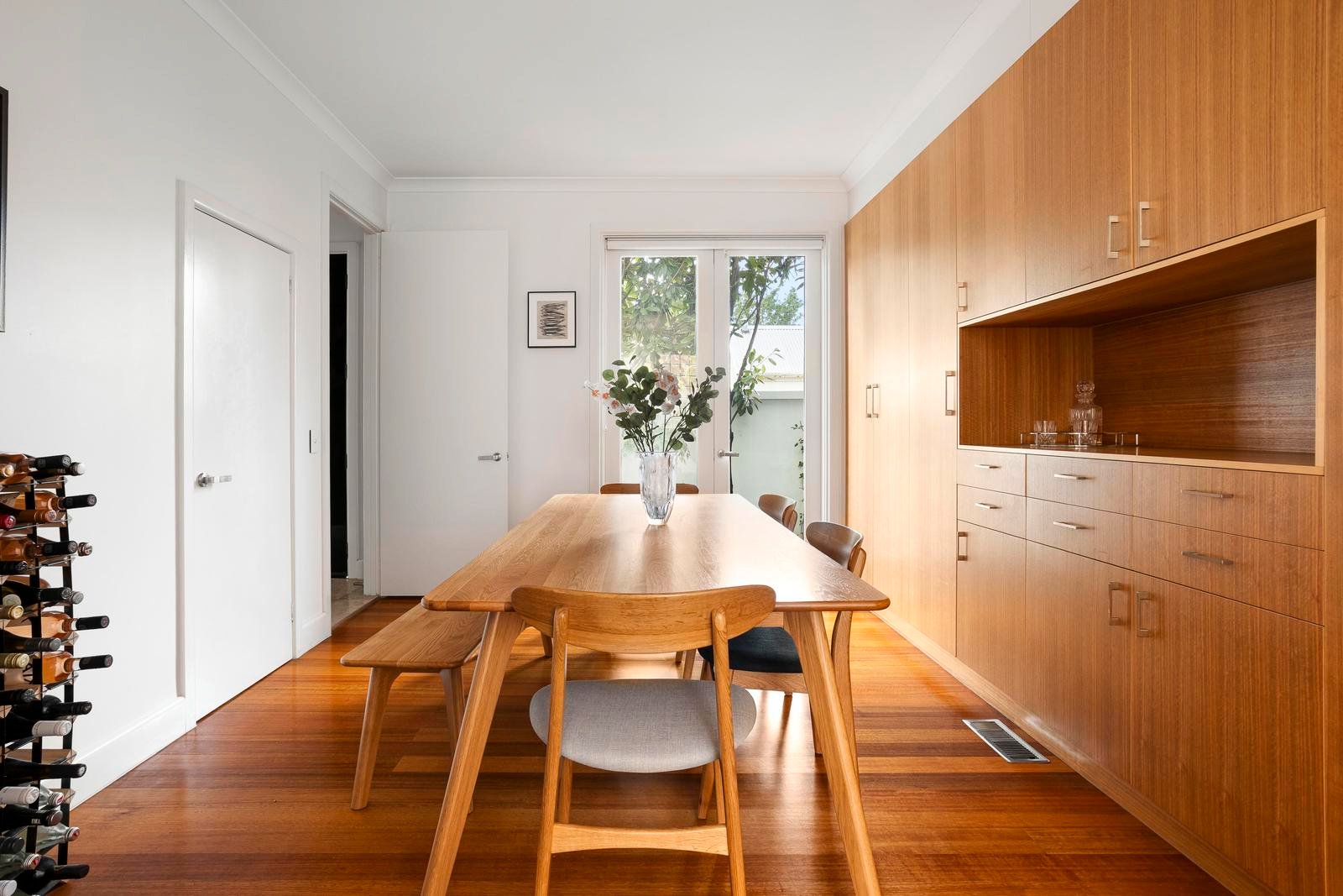Beyond a street presence inspired by Georgian elegance, this exceptional north-facing residence unfolds into a series of beautifully curated, light-filled spaces designed for modern living. A refined living room and separate dining domain offer versatility and style, enhanced by an impressive wall of integrated cabinetry that delivers substantial storage without compromising aesthetics.