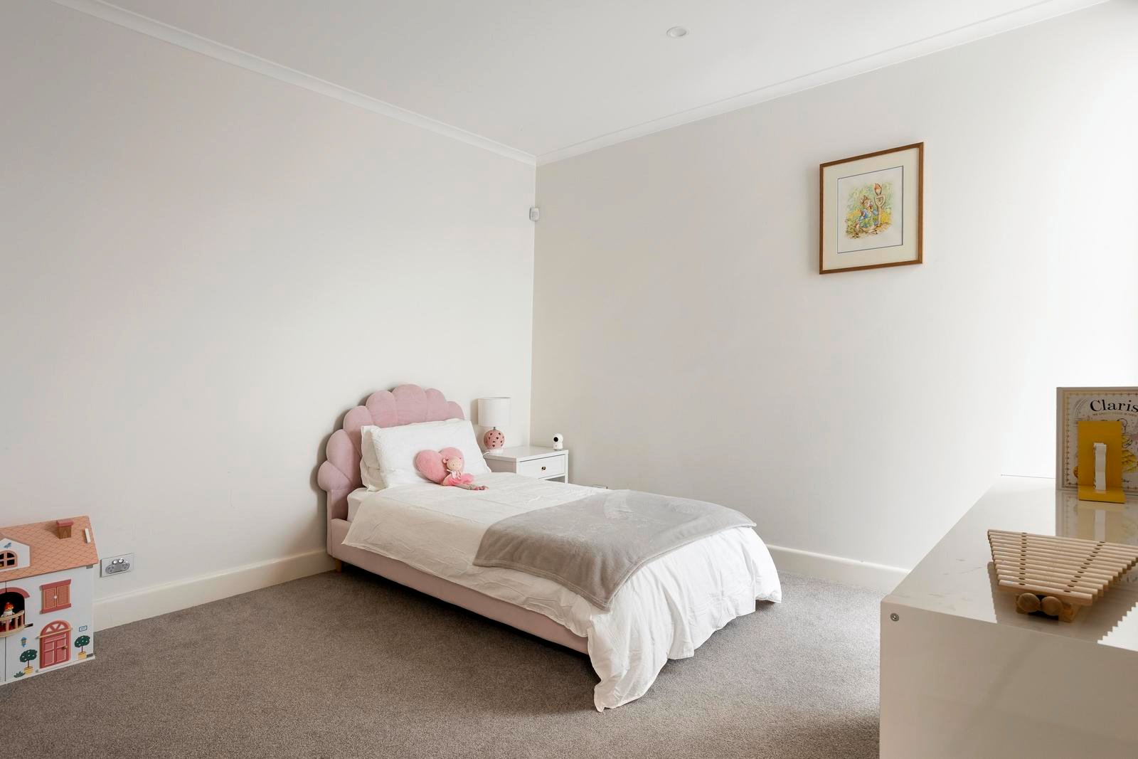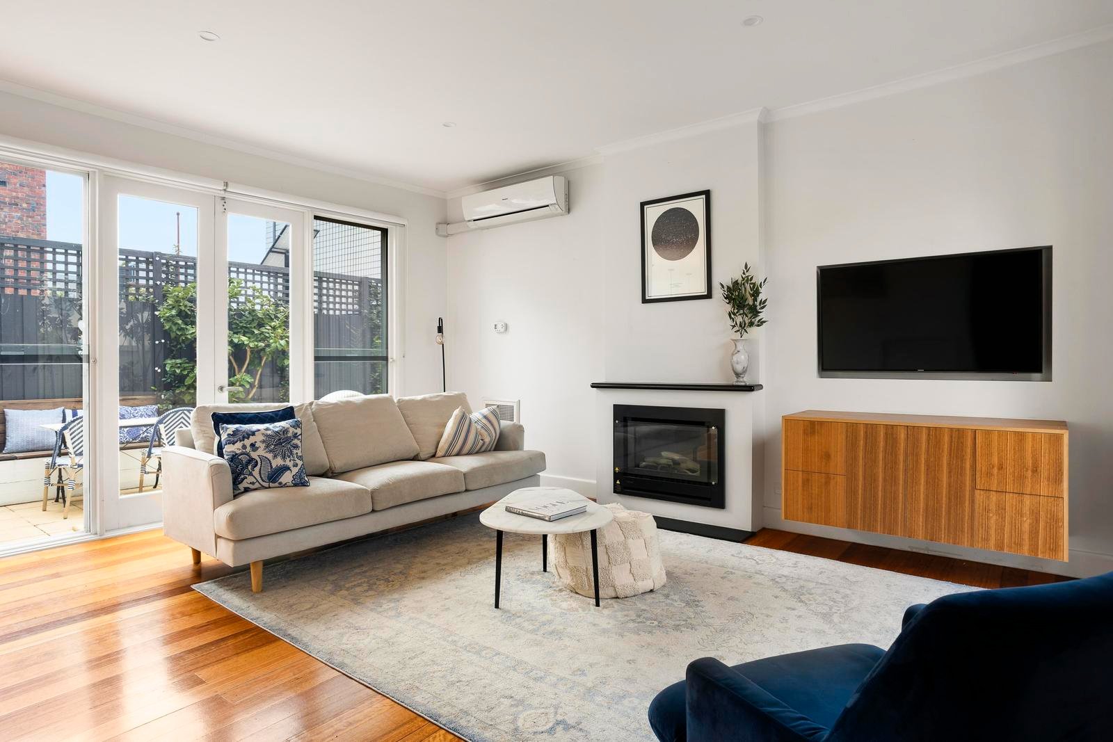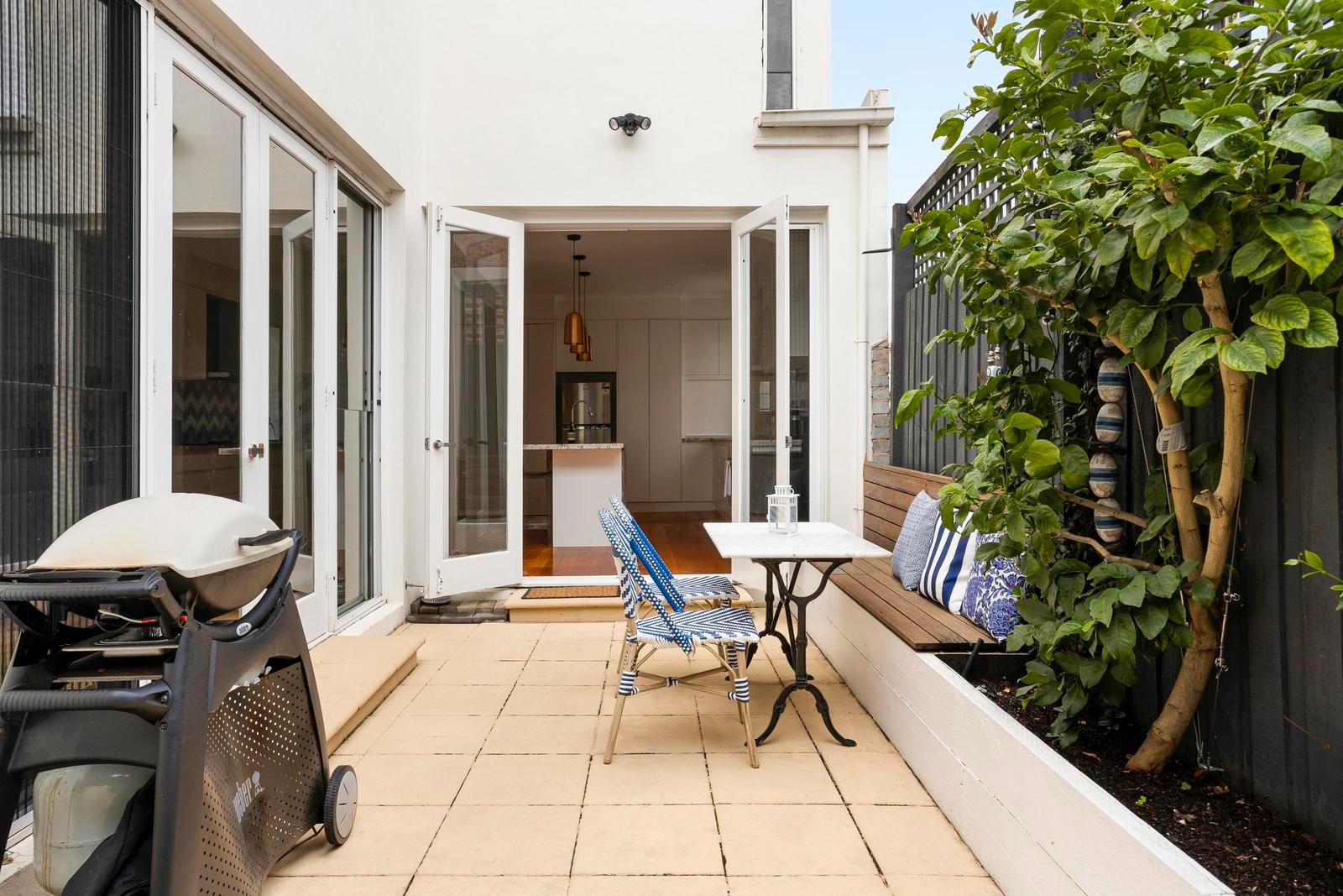 The connection to the outdoors is equally compelling. A landscaped garden designed by Simon McCurdy creates a serene backdrop for entertaining, complemented by a thoughtfully crafted alfresco deck that enhances year-round enjoyment.
