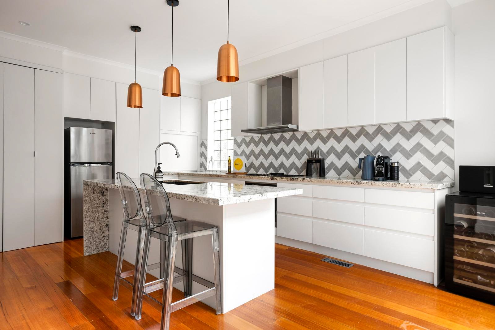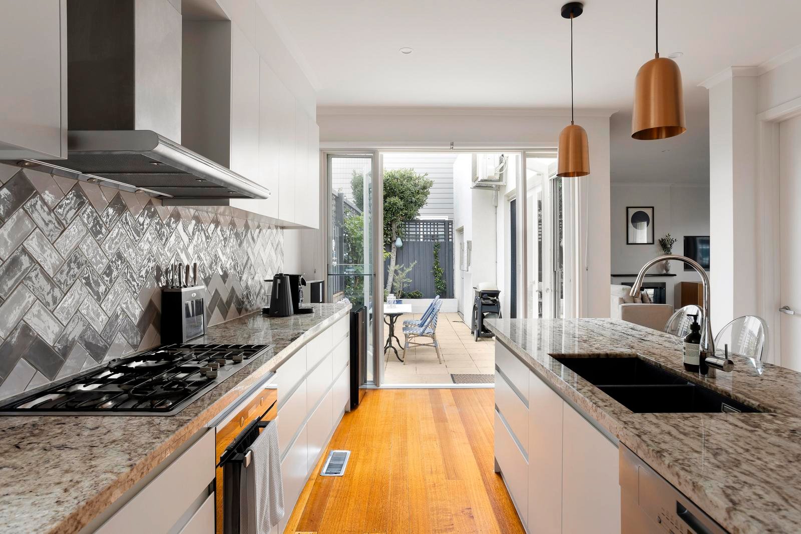 The open-plan kitchen impresses with sleek granite surfaces, a five-burner gas cooktop, Miele appliances and a newly installed dishwasher, delivering both functionality and sophistication.
