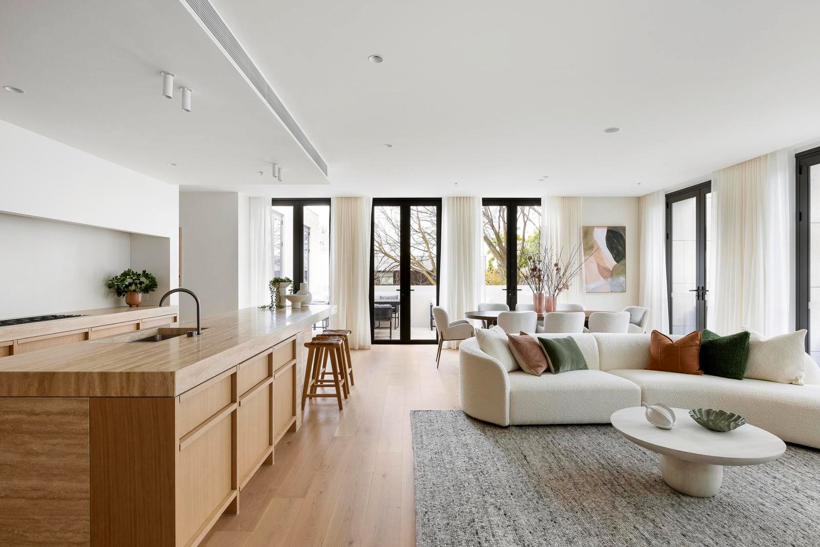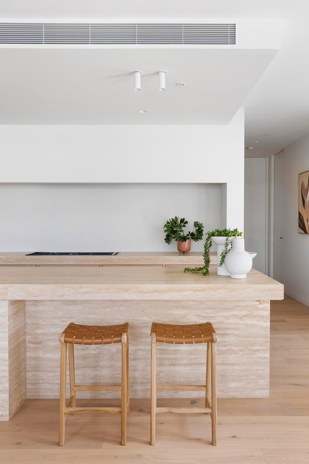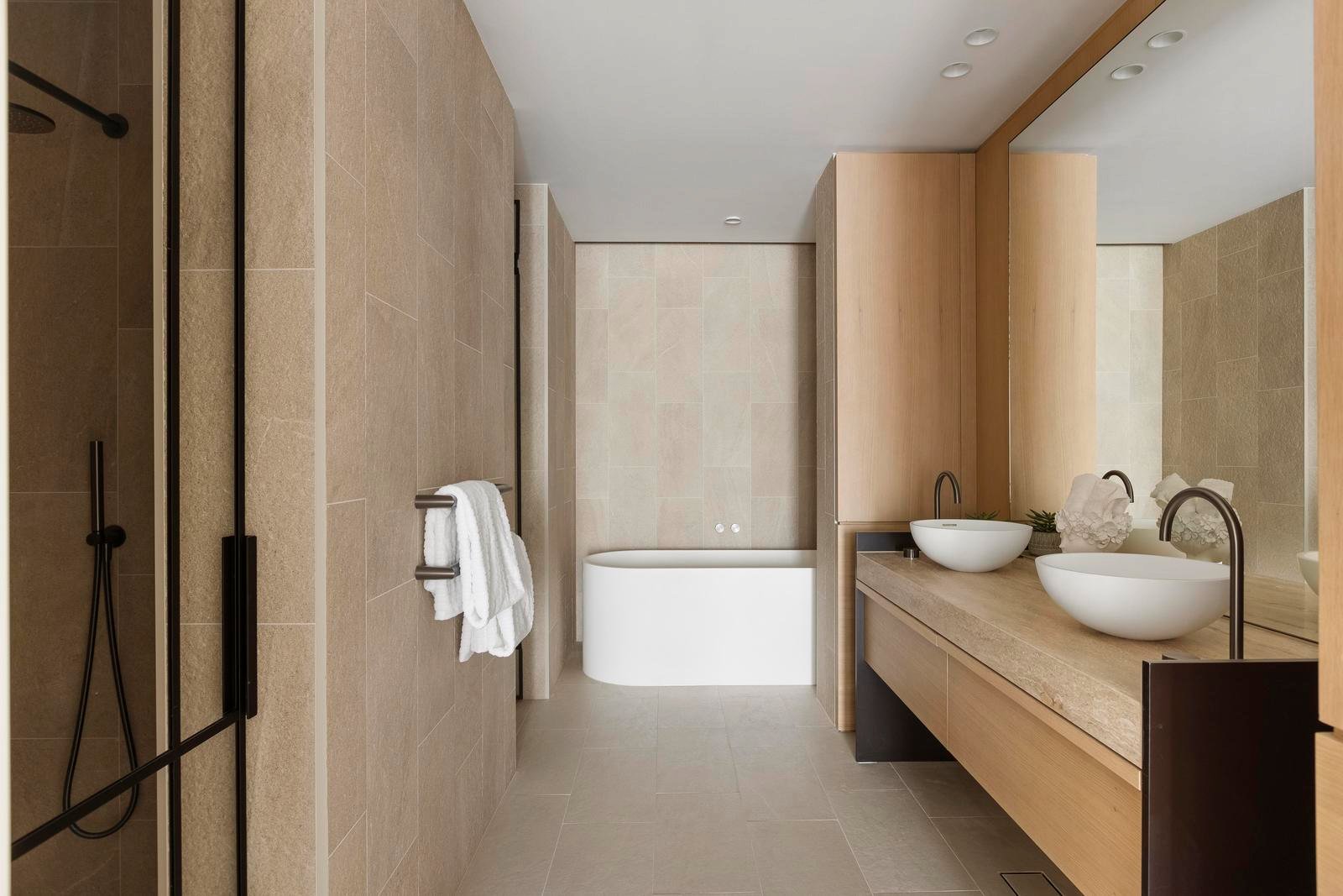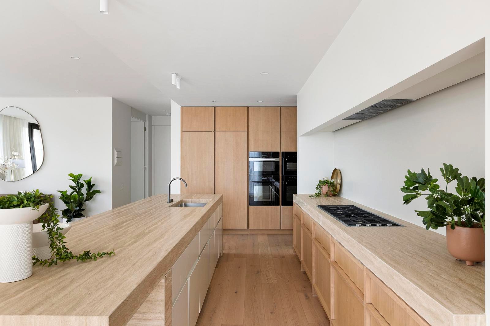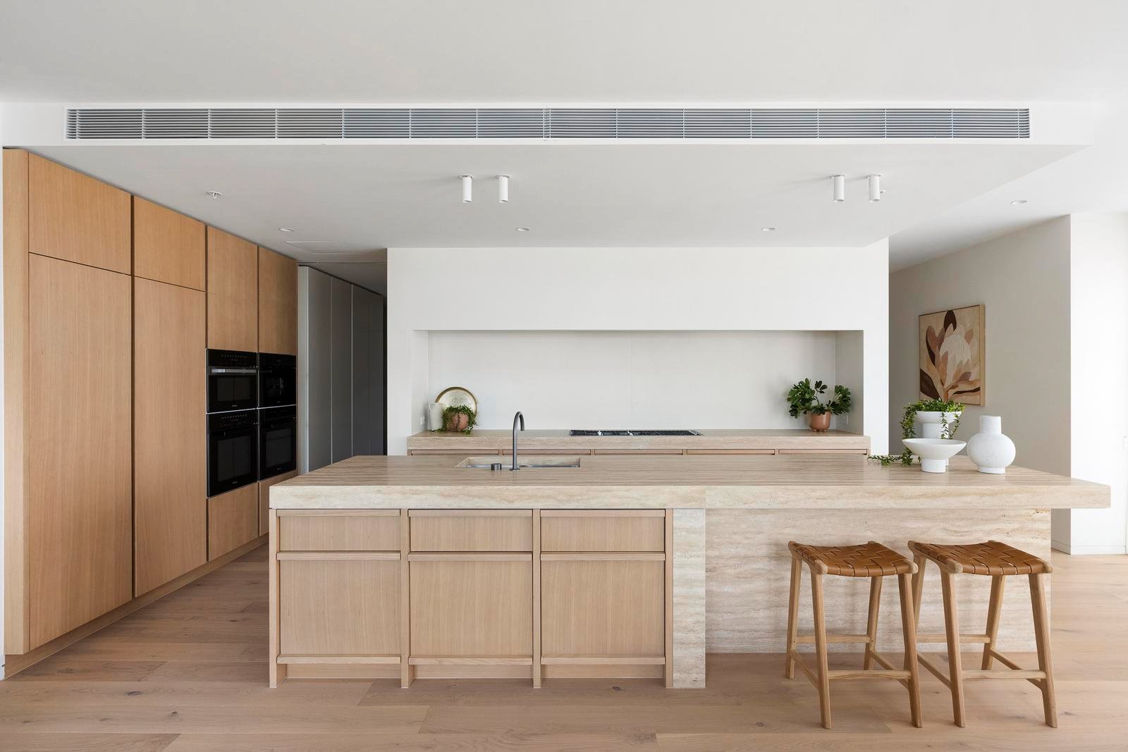 The palette is rich and sophisticated—travertine and limestone layered with pale timber and subtle texture. The kitchen’s sculptural island is a piece of art, anchoring the living space with complementary Miele and Barazza appliances and a concealed butler’s pantry. Bathrooms are immersive and elegant, wrapped in stone with twin basins and a freestanding bath.