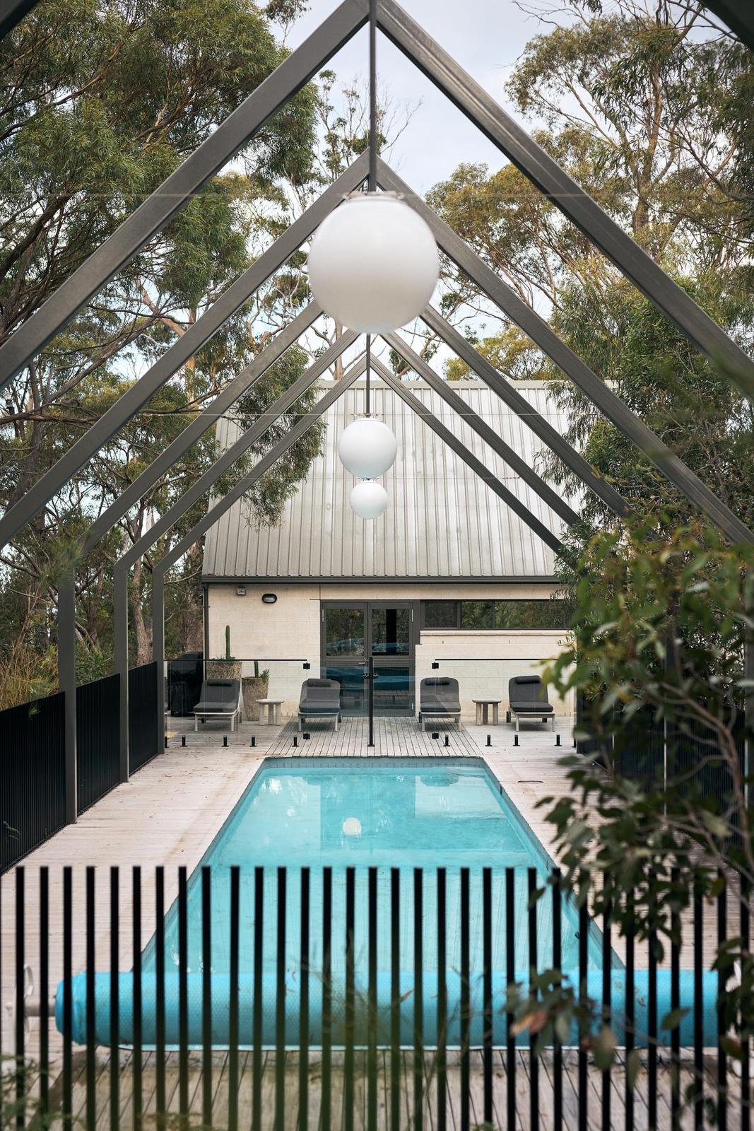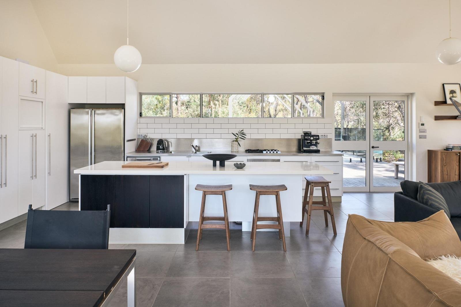 Recently, and beautifully, renovated by Ferguson Building Solutions, with interior design by Laura Wells of Pholio, the home showcases new timber flooring throughout, freshly painted interiors and exterior, and a new pool heater and fence. Every detail feels fresh, inviting, and ready to enjoy. The residence unfolds in a striking pavilion form, defined by dramatic cathedral ceilings, walls of glass, and warm natural finishes. The open-plan living area forms the heart of the home, anchored by a fireplace and framed by expansive glazing that captures sunlight and views, while the contemporary kitchen connects seamlessly to the dining zone with its full-height windows that create the sensation of dining among the trees.