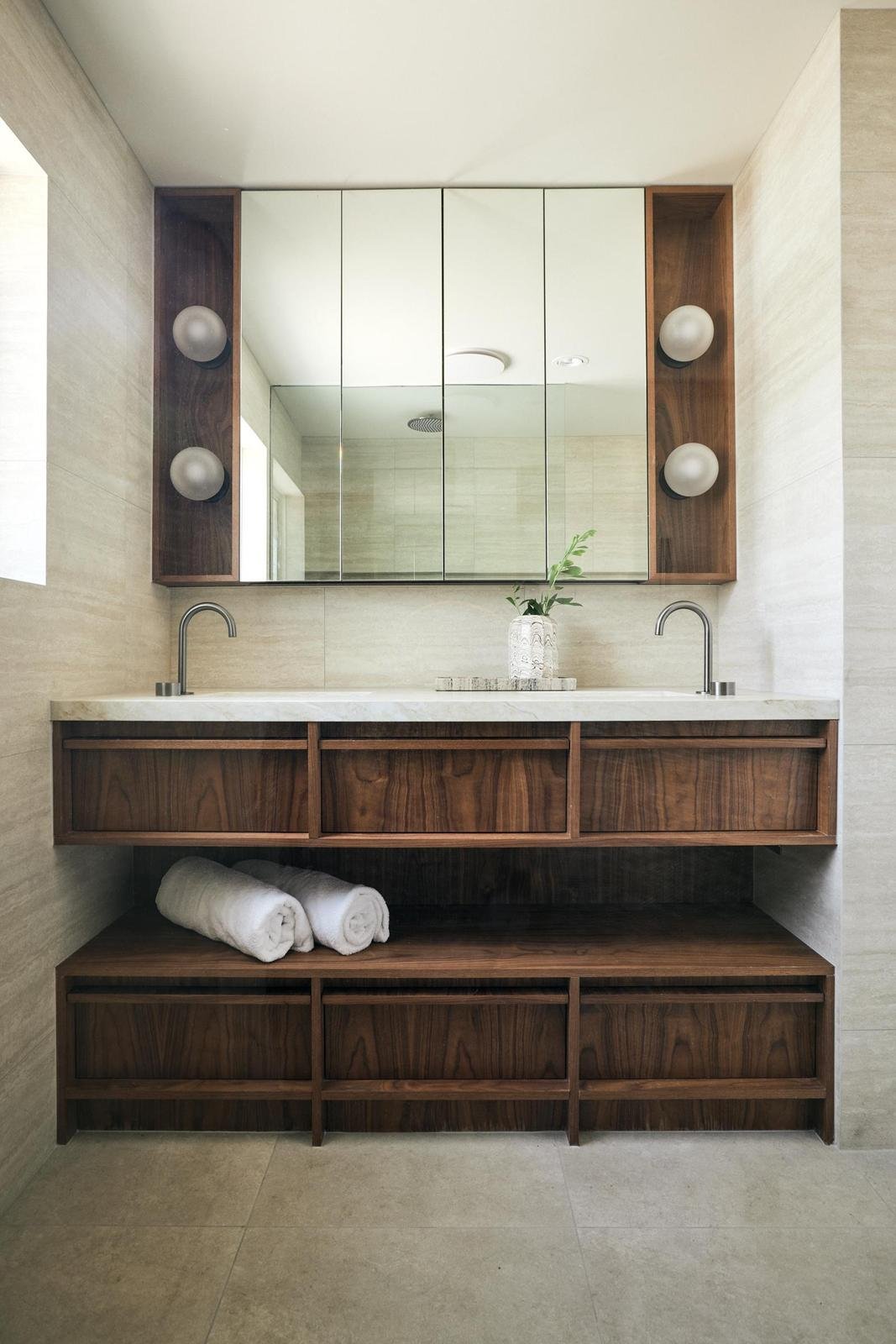 Accommodation is generous, with five bedrooms and three bathrooms arranged to provide privacy and flexibility. A separate guest wing and dedicated children’s retreat make the home ideal for hosting family and friends or offering short-stay accommodation. Each bedroom enjoys its own outlook, from leafy bushland scenes to distant ocean horizons, reinforcing the home’s connection to its surroundings.