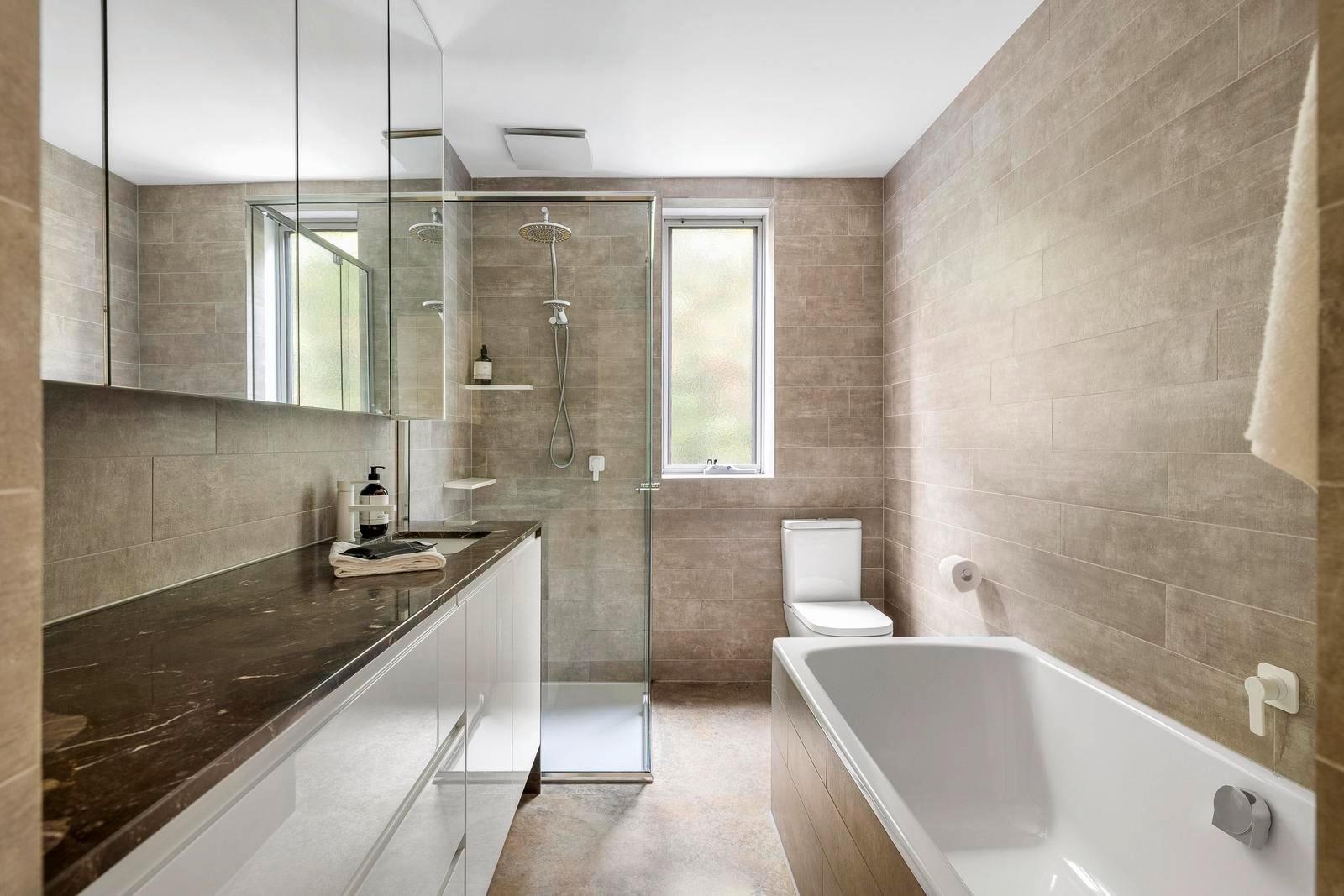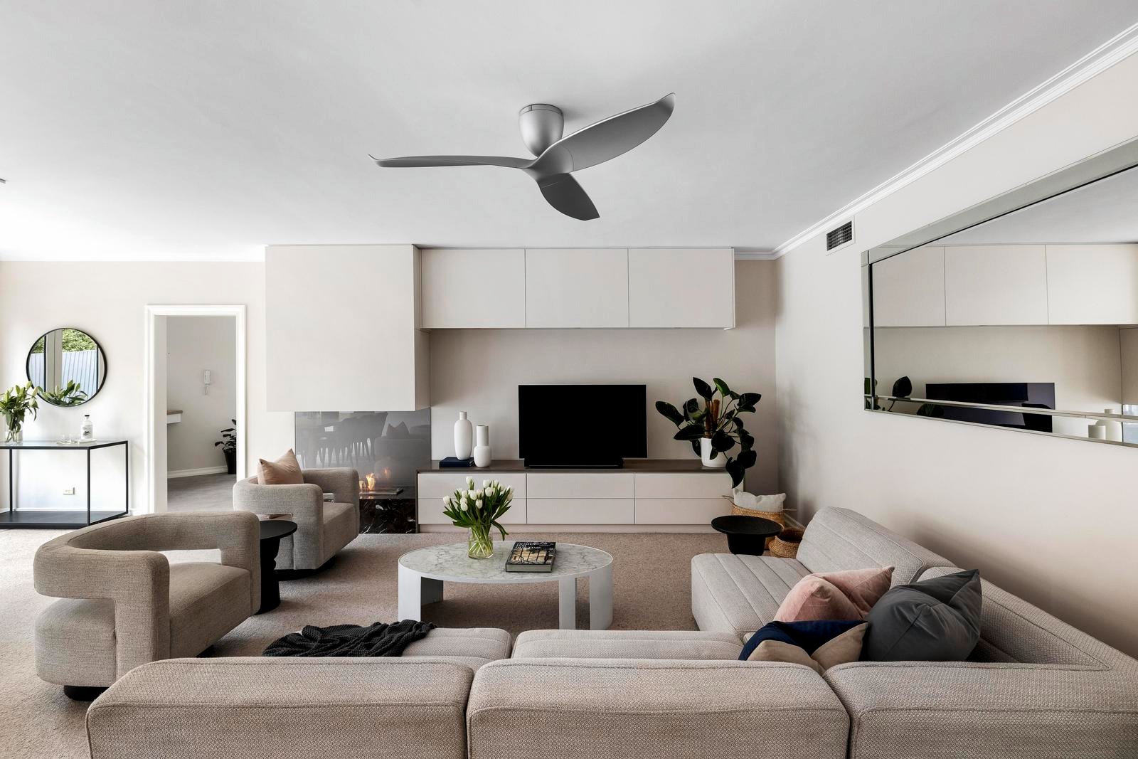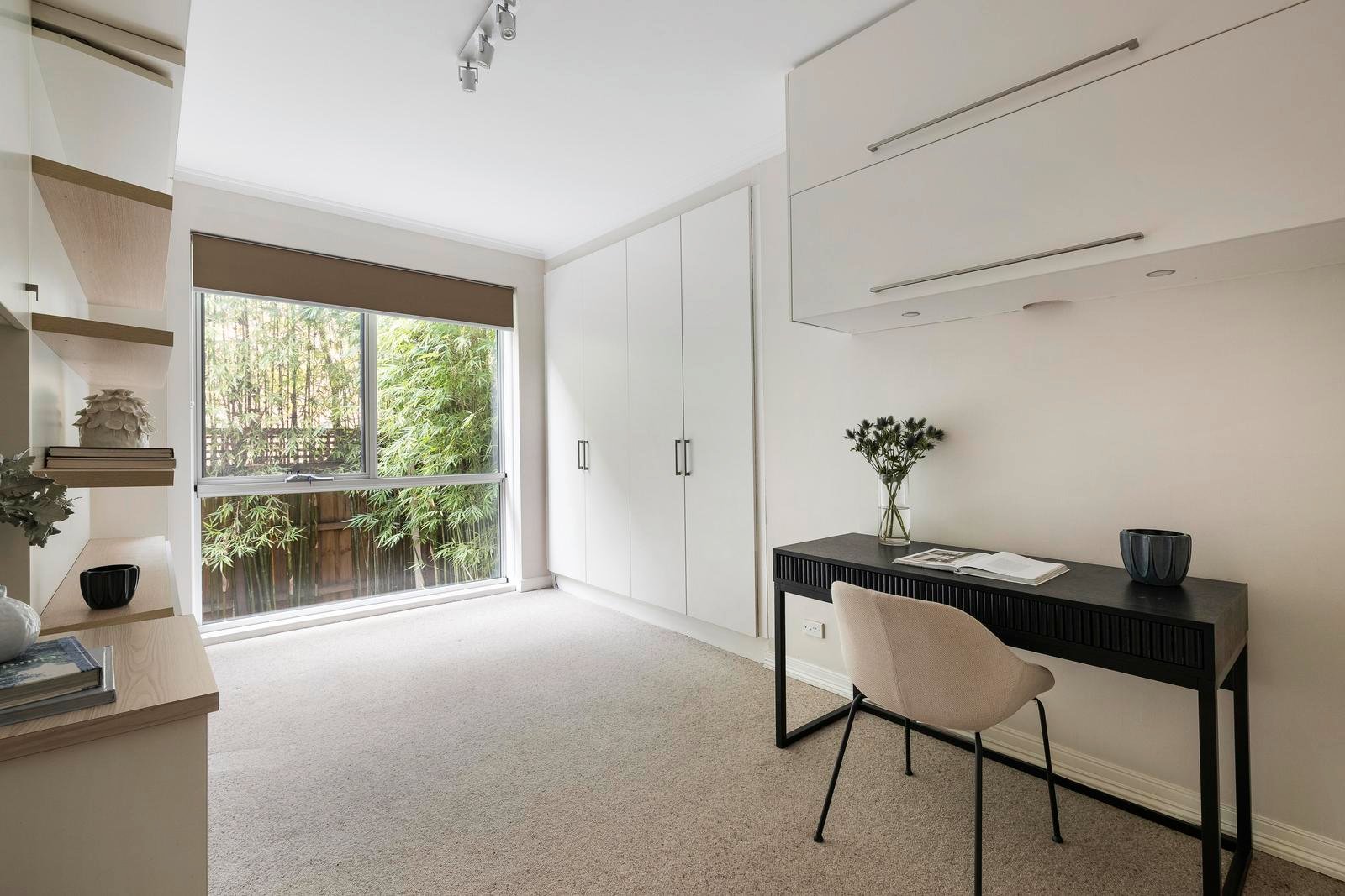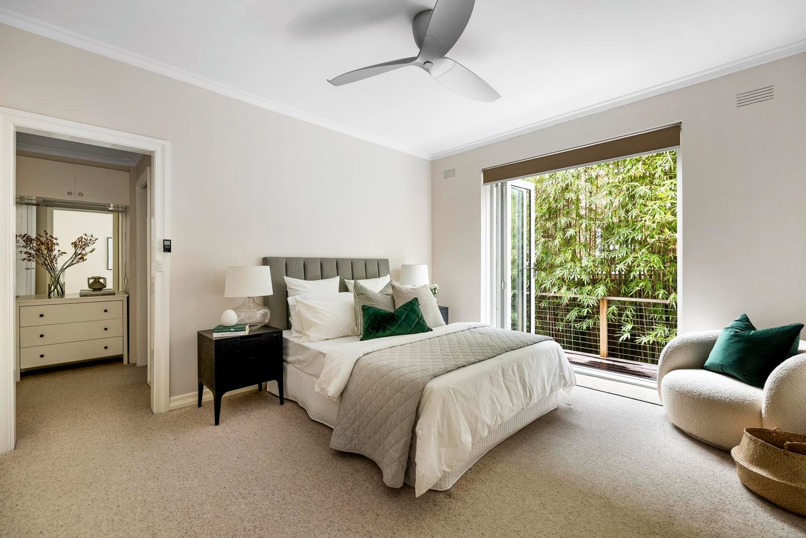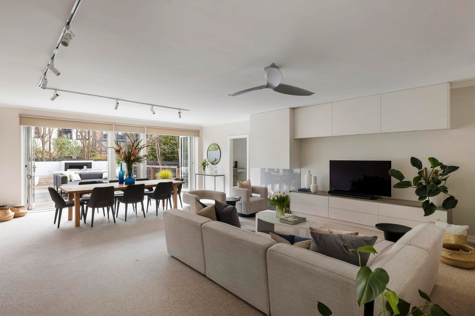 Inside, the home is built for all seasons. In cooler months, cosy up beside the marble-framed Ecosmart fireplace in the main living area amongst plush carpet, warm neutrals, and garden views. When the sun’s out, throw open the bi-folds and let life flow indoors and out.