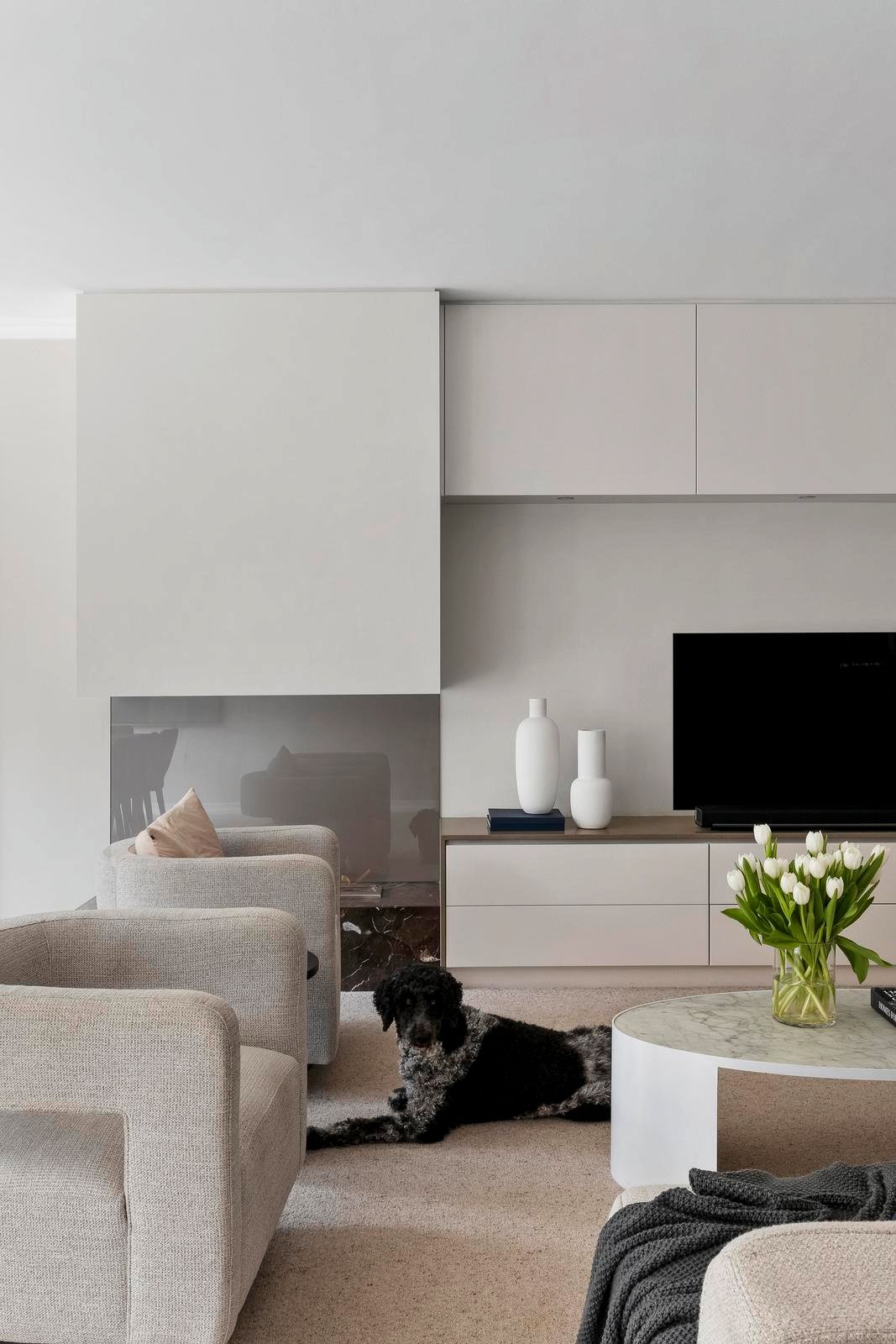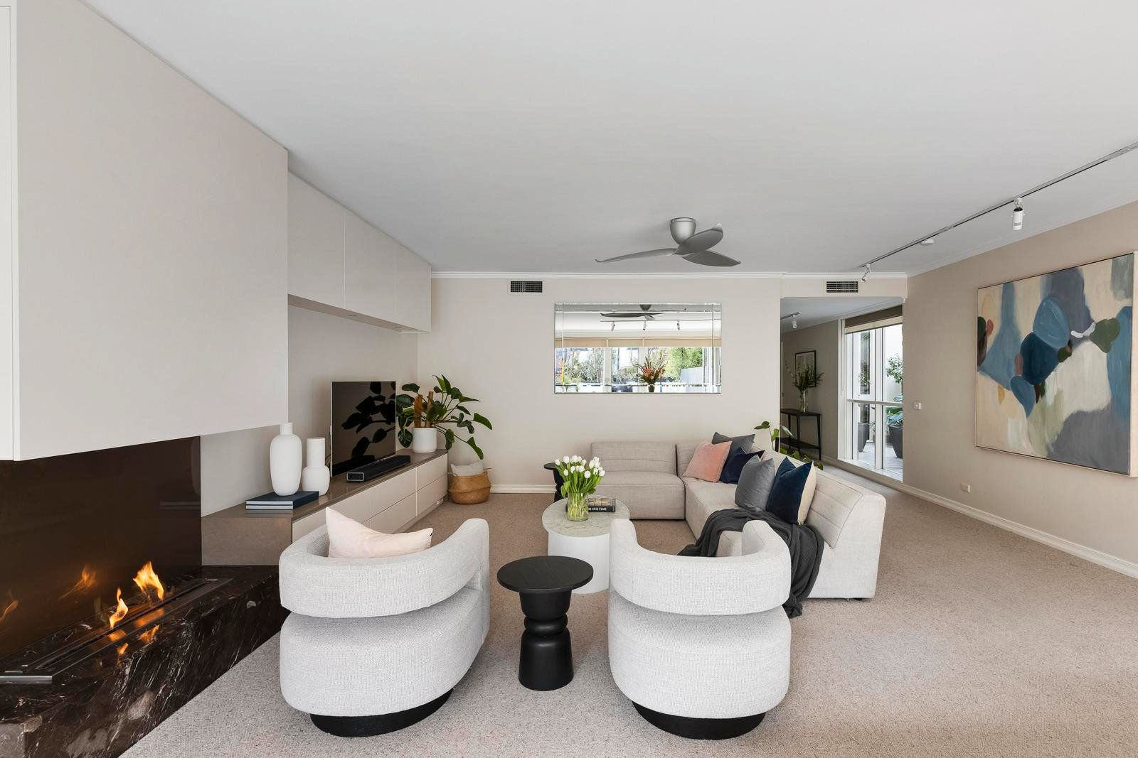 * Marble-framed Ecosmart fireplace in light-filled living area