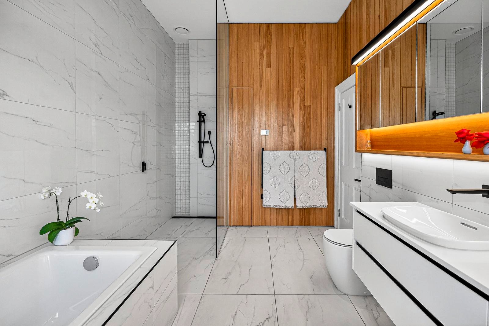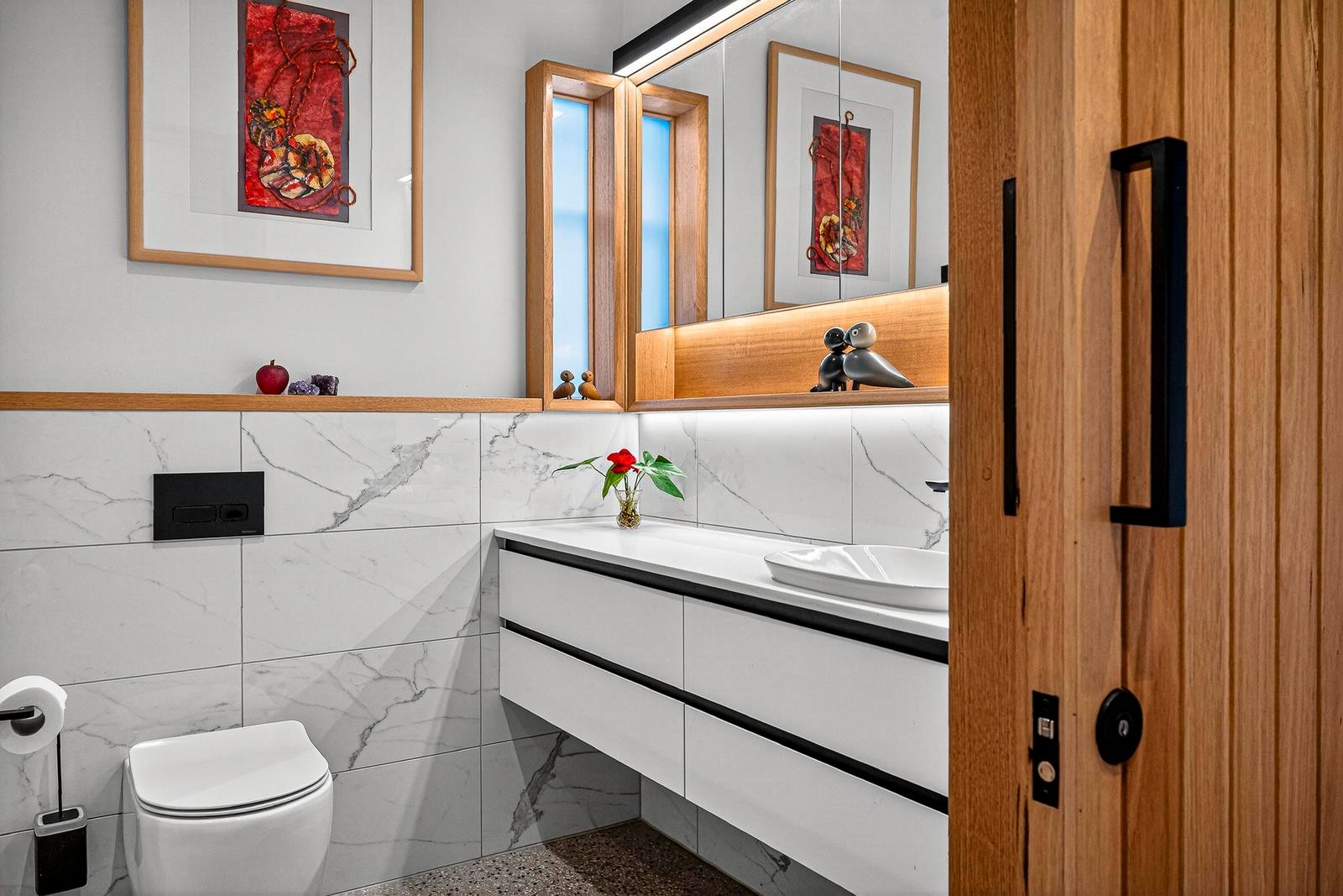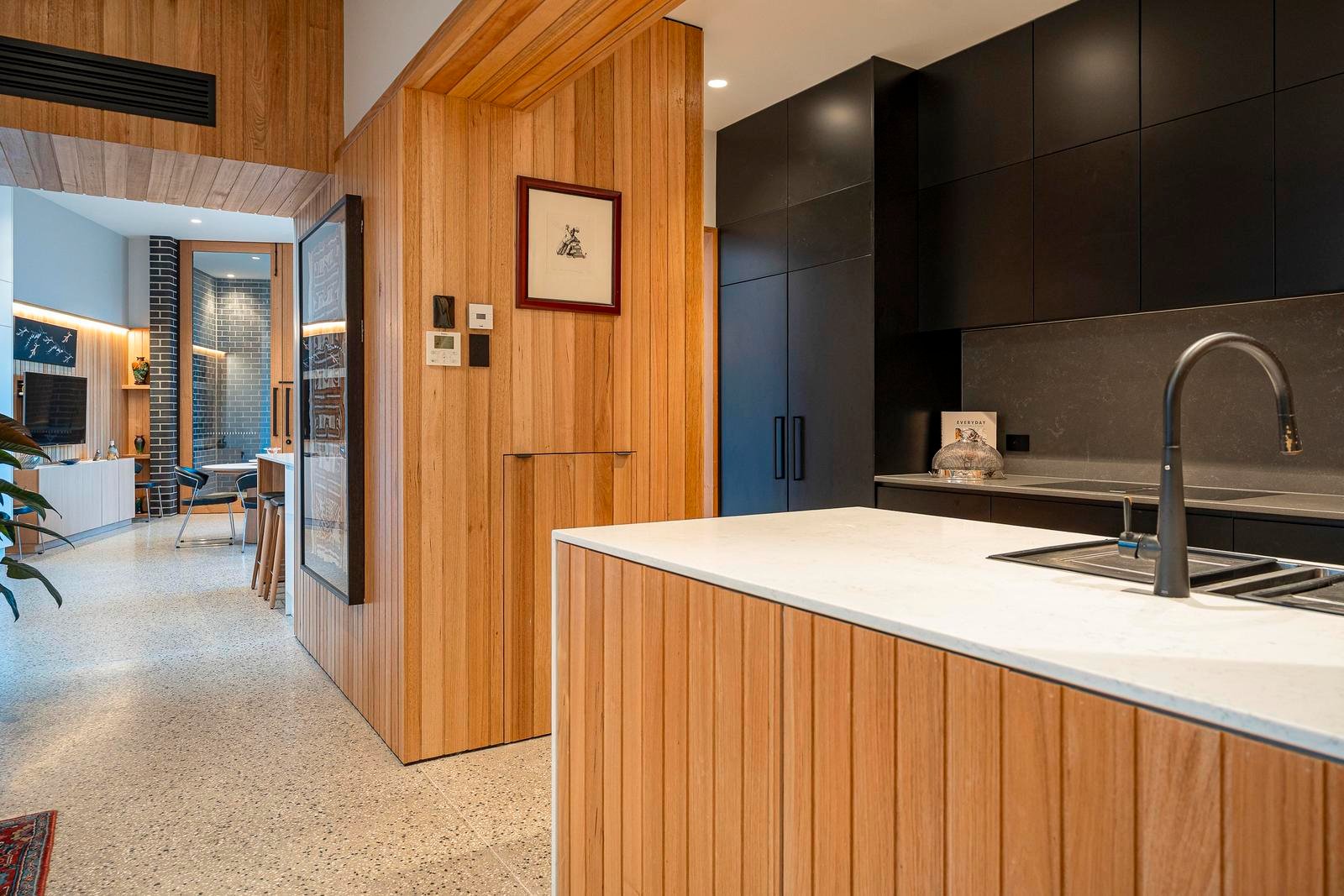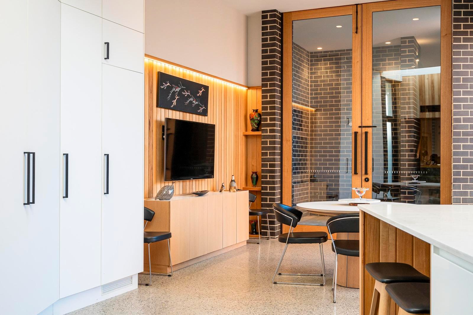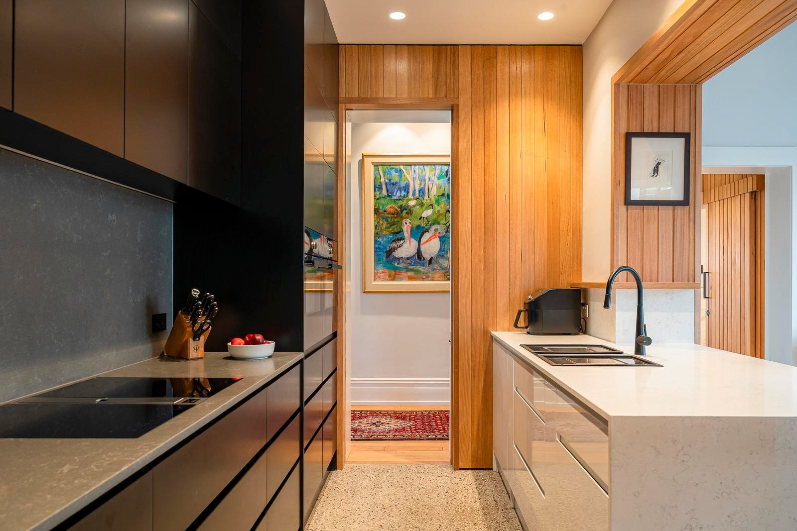 The ground floor unfolds from a gracious entry foyer to an elegant sitting room, study or fourth bedroom, followed by a refined formal dining room. At the heart of the home is the beautifully considered kitchen and informal dining and family wing, finished with polished concrete floors and framed by floor to ceiling double glazed windows that overlook a private and secure courtyard. This central living zone connects effortlessly with both the formal rooms and outdoor areas, further enhancing the home’s capacity for entertaining on any scale. This level also includes a bathroom, powder room, storeroom, and cellar, and a well-appointed laundry.