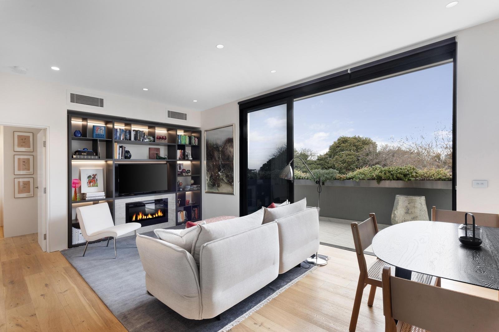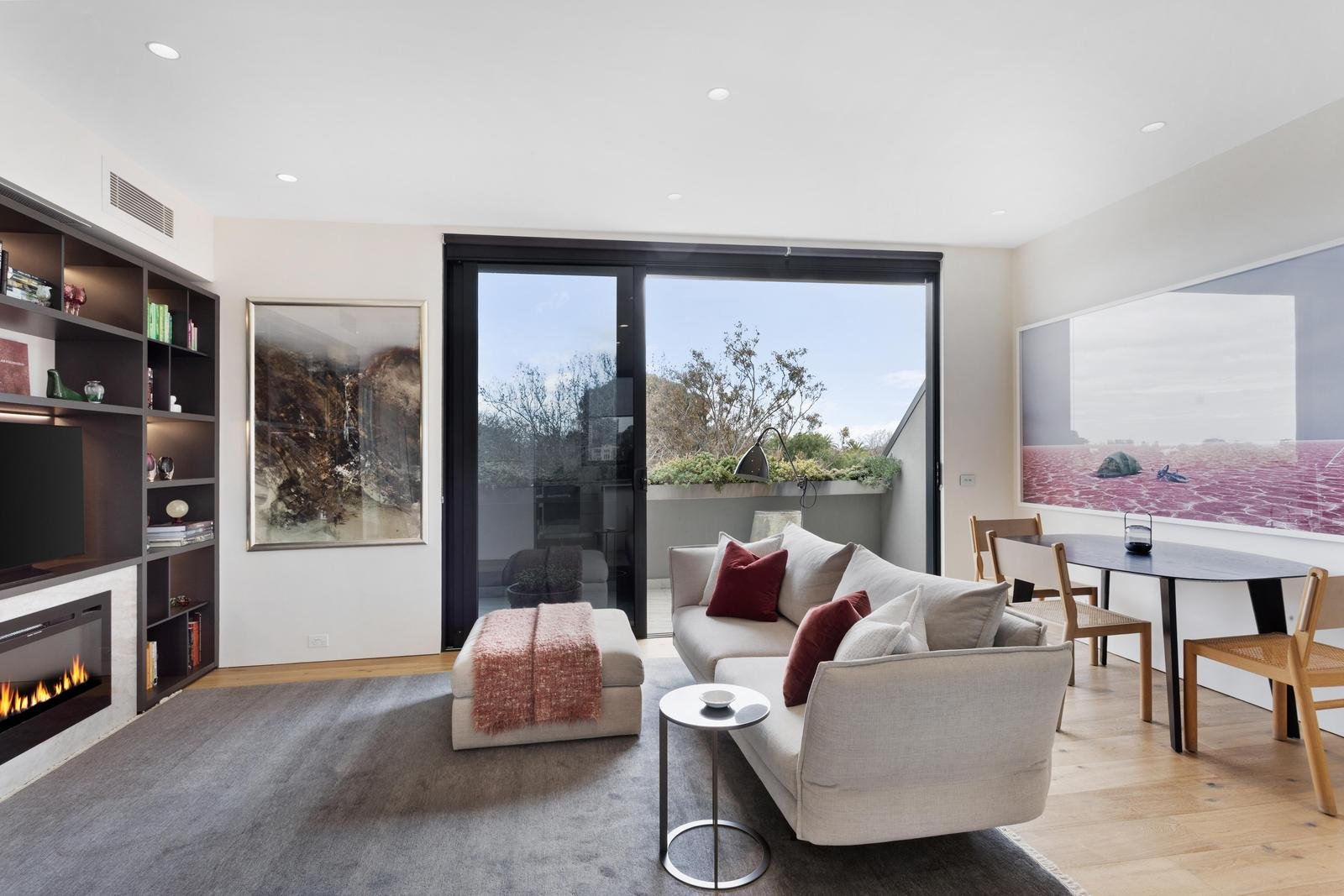 Inside, the design and craftsmanship are world-class. A custom Poliform wall unit, Italian stone fireplace with Jetmaster heater, and app-controlled lighting bring both style and ease. The Miele kitchen is sleek and functional, while European oak floors and solid American oak staircases introduce natural warmth.