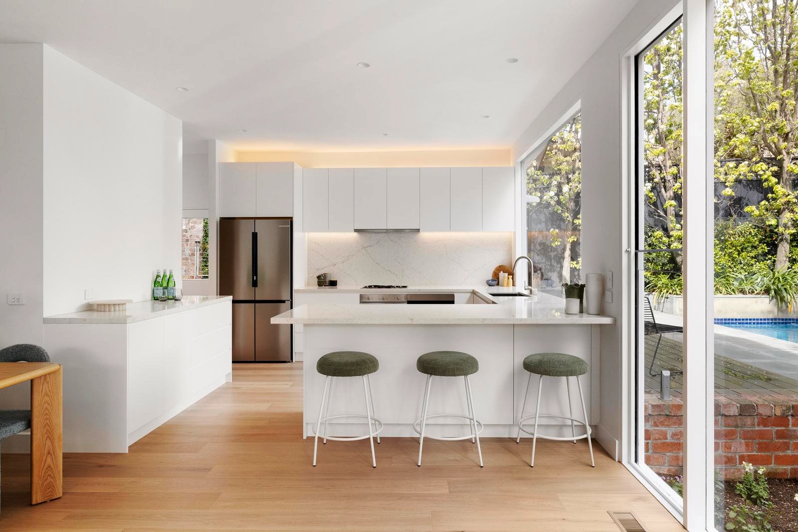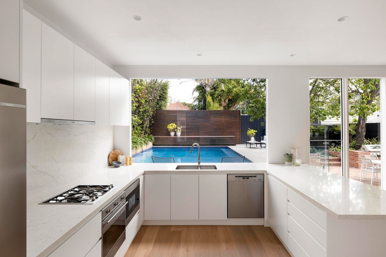Bathed in natural light, the expansive open-plan living and dining domain flows to a spectacular kitchen, where a vast picture window perfectly frames the tranquil garden and pool views. The adjoining butler’s pantry opens to a private courtyard, adding yet another seamless connection to the outdoors.