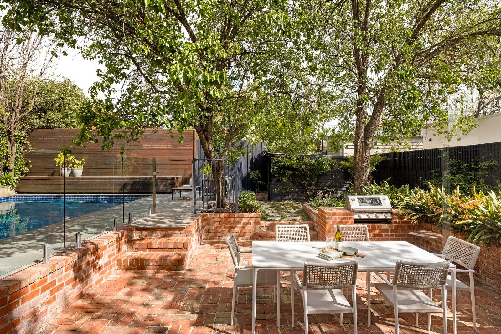 The rear garden is idyllic. The red brick terrace forms the heart of this beautiful landscape, encircled by greenery and shaded by gorgeous feature trees. A built-in barbecue sits quietly within the garden’s edge, ready for long lunches and relaxed evenings. Beyond, the solar-heated pool shimmers in the sunlight, completing this inviting oasis.