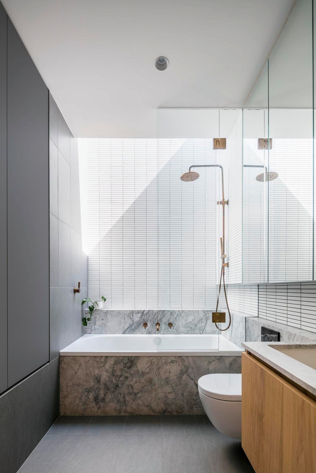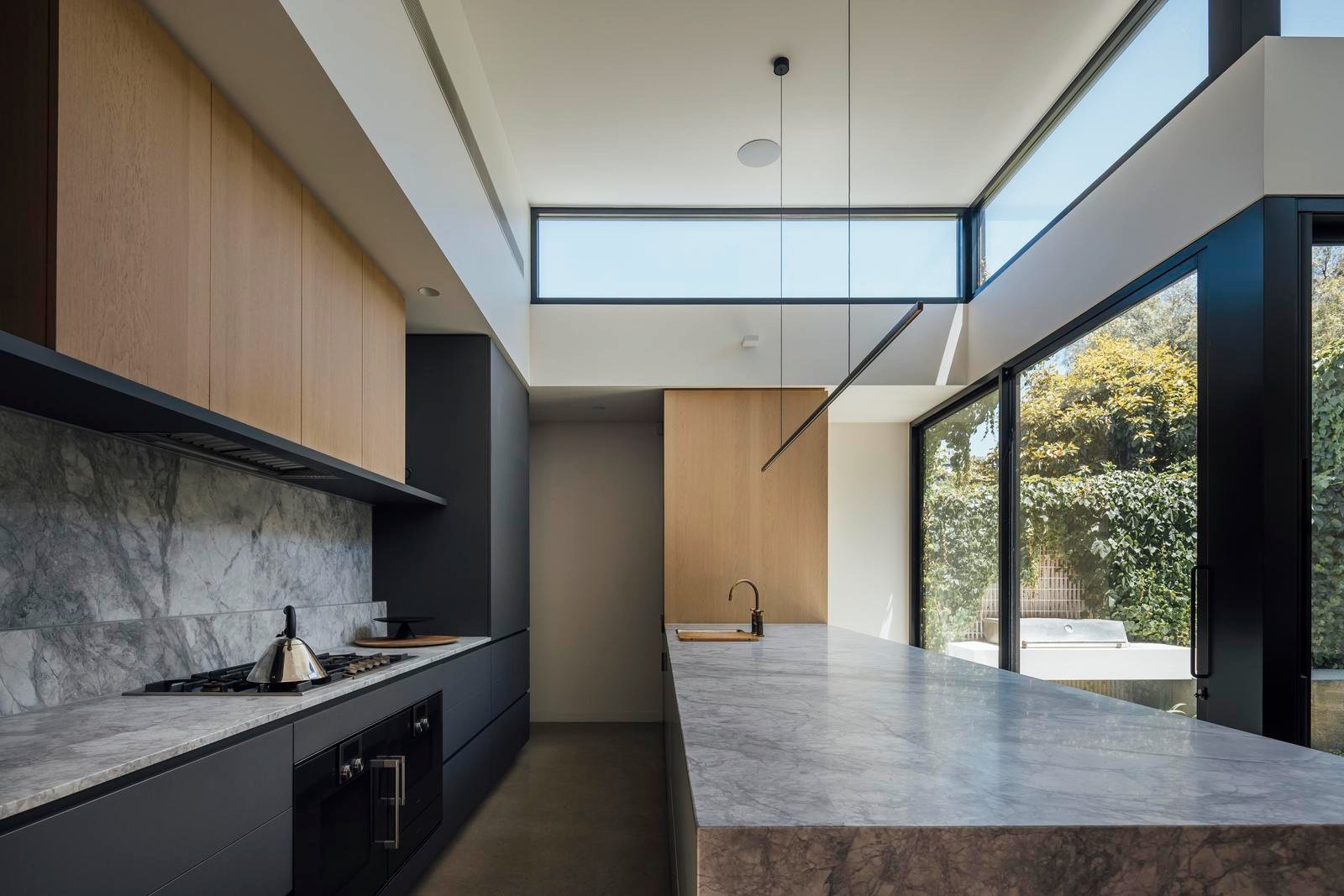 A gourmet kitchen with honed Carrara marble and Gaggenau appliances anchors the home, opening to bluestone courtyards and leafy gardens ideal for entertaining. Thoughtfully designed with integrated storage and modern comforts throughout, this architectural residence enjoys an unbeatable location moments from Chapel Street dining precinct, Windsor Station, parks and elite schools.