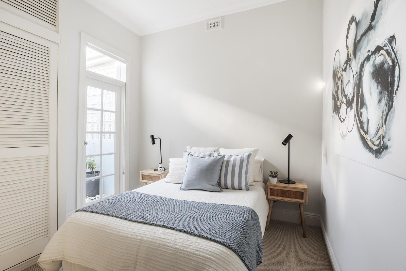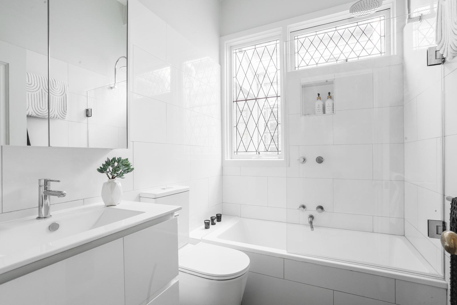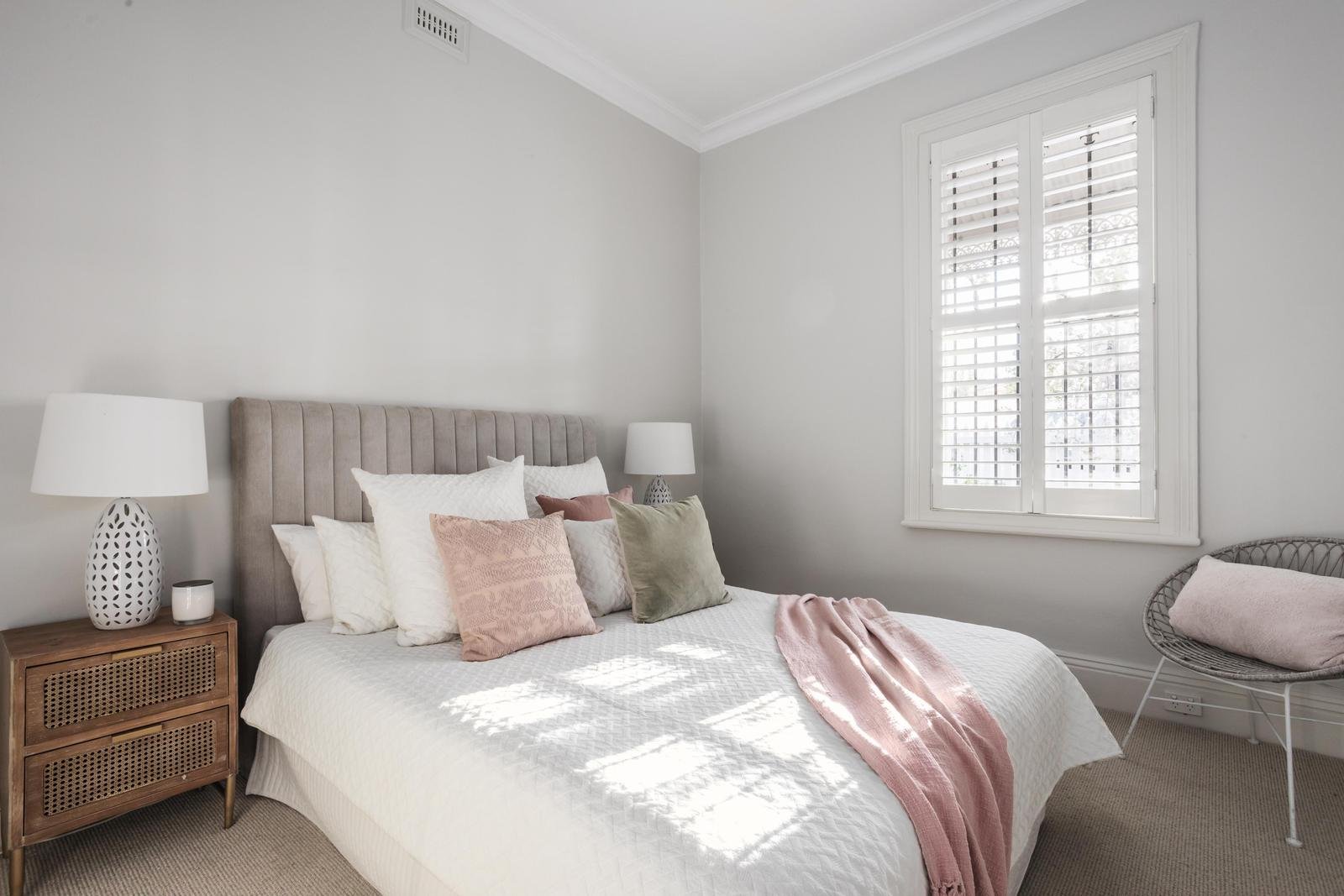 Behind its lacework façade and picket fence, this beautiful Victorian reveals an interior defined by light, proportion and thoughtful contemporary upgrades. High ceilings, polished timber floors and a graceful arched hallway set an elegant foundation, balancing period charm with a sense of calm and simplicity. The bedrooms are serene and inviting, filtered with soft light through plantation shutters, while the bathroom brings a crisp, modern contrast with white tiling and subtle window detailing.