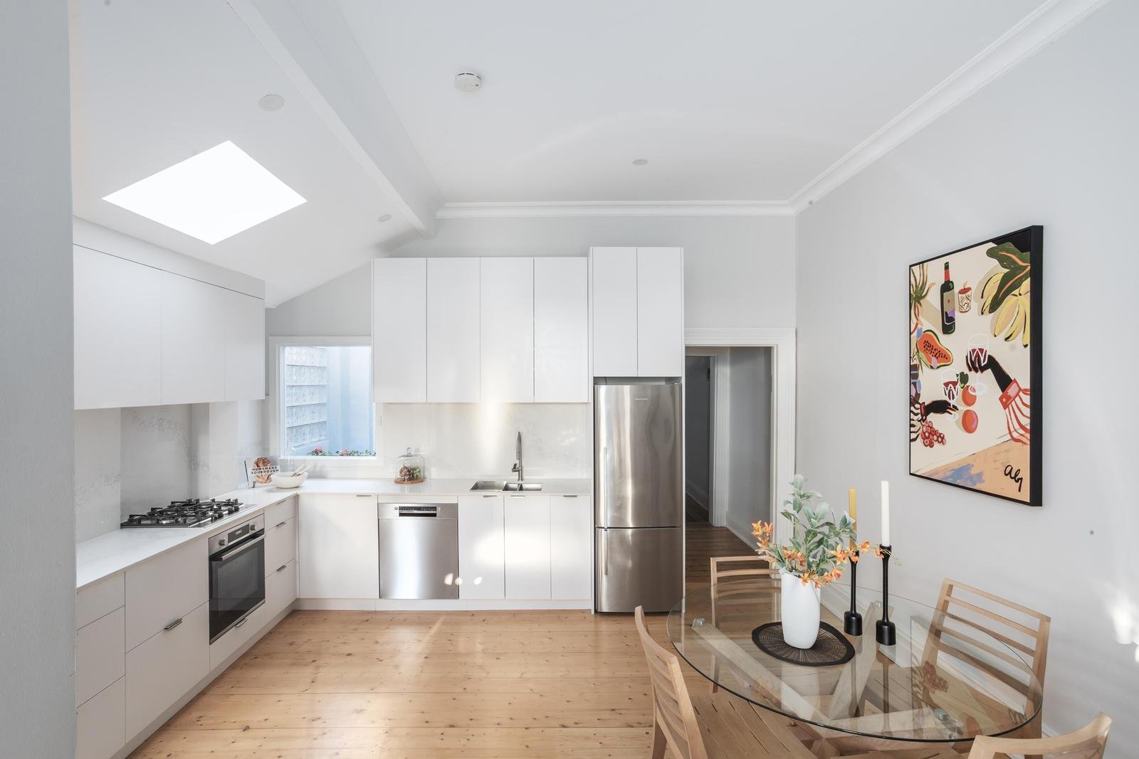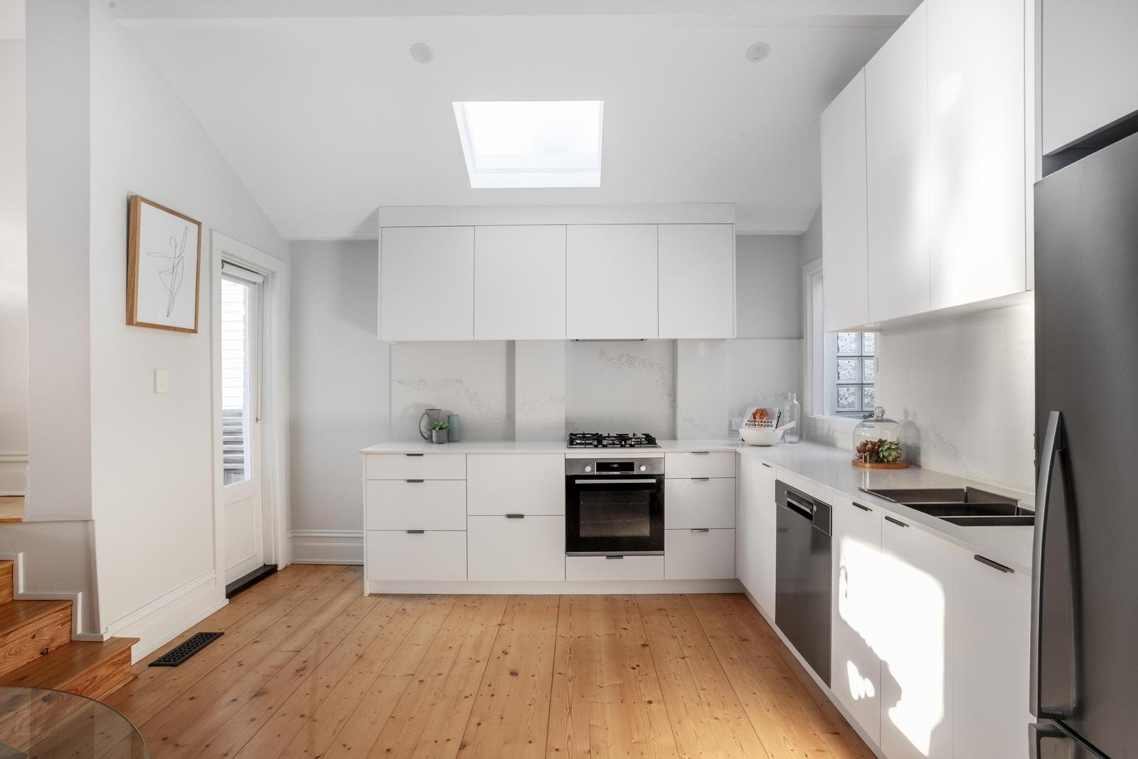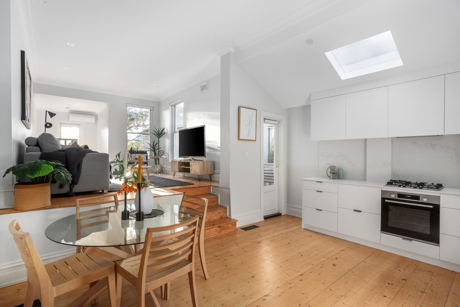 At the rear, a skylit kitchen anchors the home—sleek, functional, and bright with natural light—flowing into a relaxed dining area, rear living zone, and balcony. Internal stairs lead down to a flexible lower-level retreat offering its own sense of privacy and versatility, ideal as a guest space, studio or work-from-home setting. The lower level offers a private courtyard with beautiful greenery and light, creating an easy connection between indoor and outdoor living.