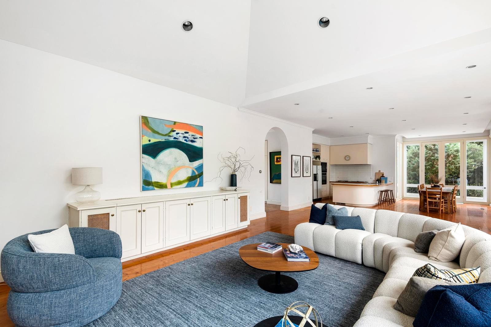 A long driveway creates a sense of quiet arrival, pulling you away from the street and into a welcoming entrance hall that immediately conveys the home’s architectural intent. Soaring ceilings and expansive glazing define the interiors, establishing a tone that is both grand and inviting.