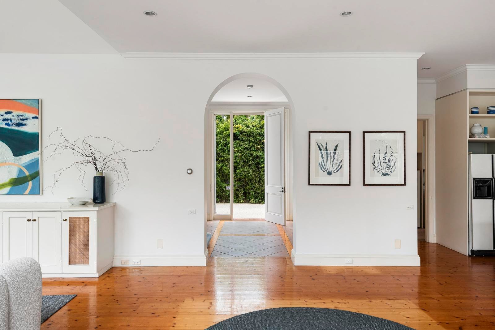 Beyond, a private rear courtyard unfolds as a tranquil garden retreat. Mature trees form a leafy canopy, creating privacy and a verdant outlook.. A rear garage and garden shed, accessed via the driveway, provide ample off-street parking and storage.