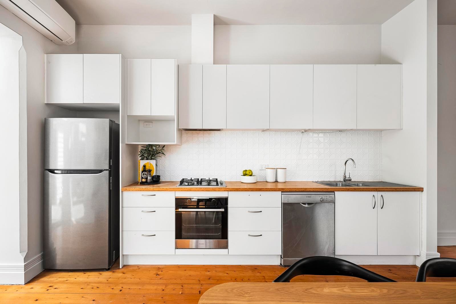 The bathroom’s modern style is matched by the quality and capability of the kitchen/dining area, where timber bench-tops, stainless steel appliances and ample cabinetry form an exceptional combination. Beyond, a decked courtyard contributes outdoor ease and creates an ideal conclusion to a property further enhanced by attic storage, move in readiness and the convenience of parking permits for three cars.