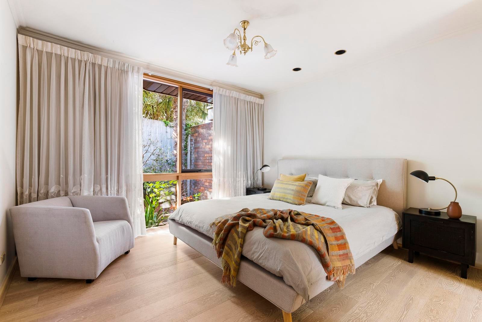 The freshly updated bathroom features stone textures, dual basins, and a walk-in shower, while outside, a private north-facing courtyard extends the living space outdoors, surrounded by an established garden and dappled light.