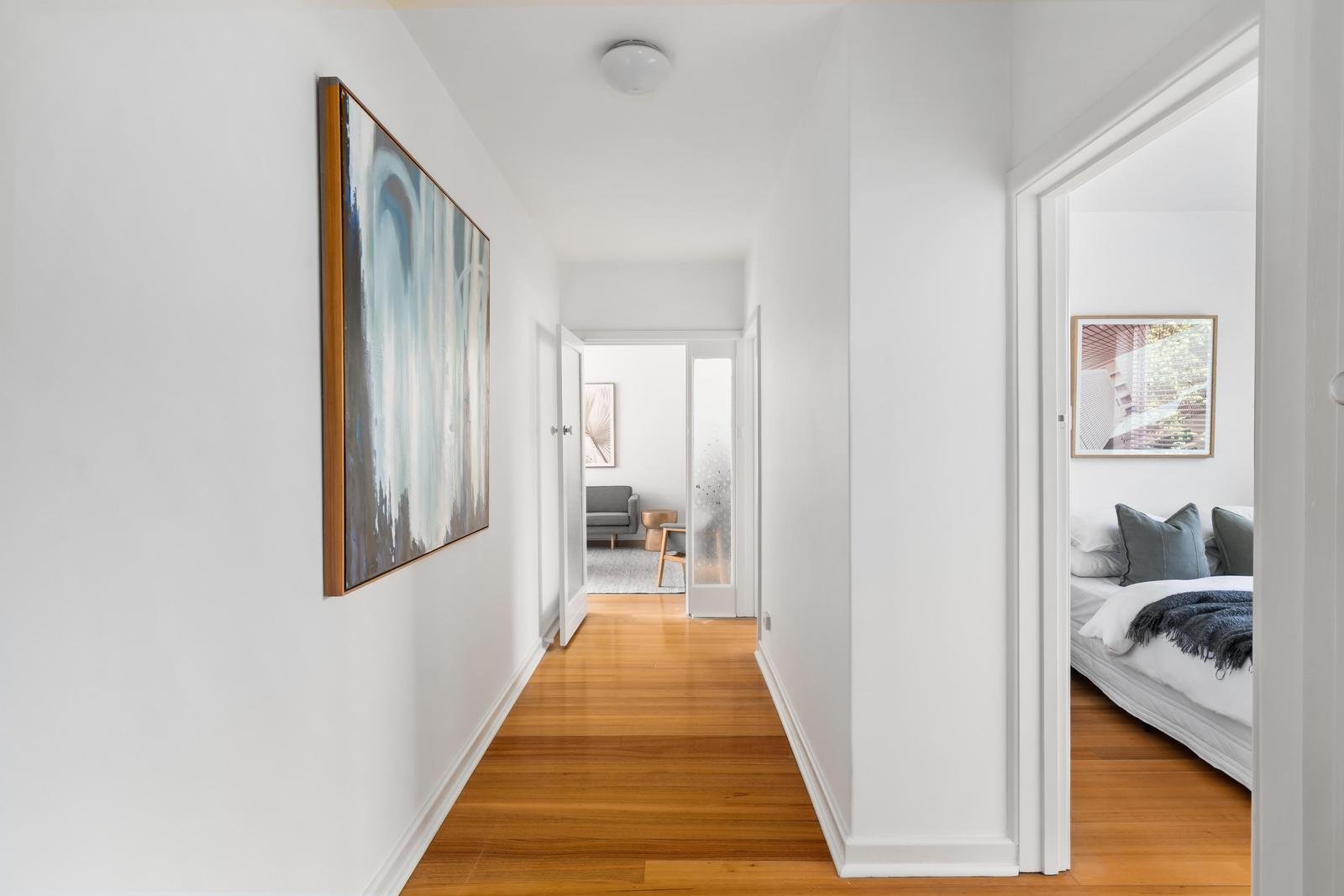 Filled with natural light and a calm, open atmosphere, this three-bedroom apartment makes the most of its elevated position and leafy views. The living room opens onto a lovely balcony, a quiet spot for fresh air and coffee breaks, while a large kitchen with built-in appliances adjoins a spacious dining area. Beautiful, polished timber floors run throughout the apartment, tying the spaces together with warmth. Each bedroom has wide windows that bring in light and views of the surrounding trees and rooftops, while the bathroom is bright and neatly tiled. Other features include an easily accessible lock-up garage and a communal bike store.